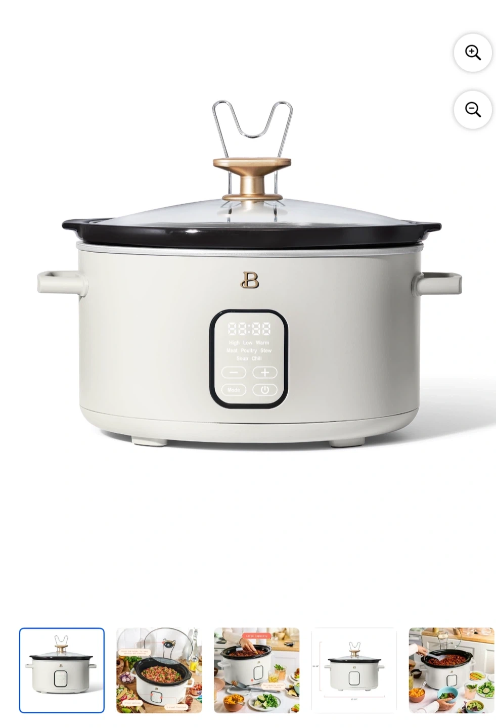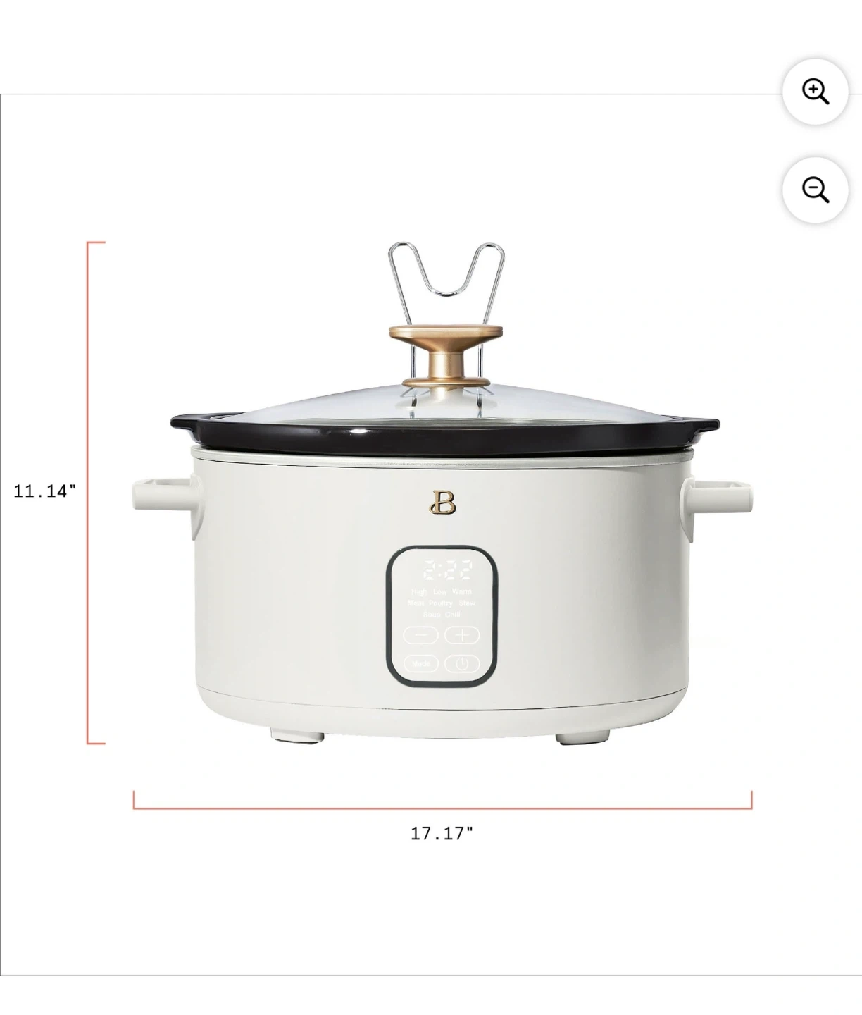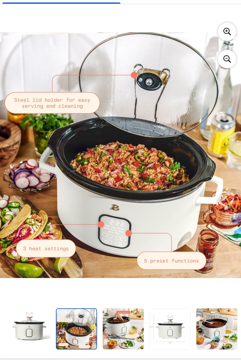 I'm selling a Beautiful Kitchenware 6-quart programmable slow cooker in the White Icing colour! This slow cooker has a touch-activated display and a large 6-quart capacity. It's perfect for preparing, setting, and enjoying slow-cooked meals. The dimensions are 17.17 inches in width and 11.14 inches in height. It also includes a steel lid holder.
