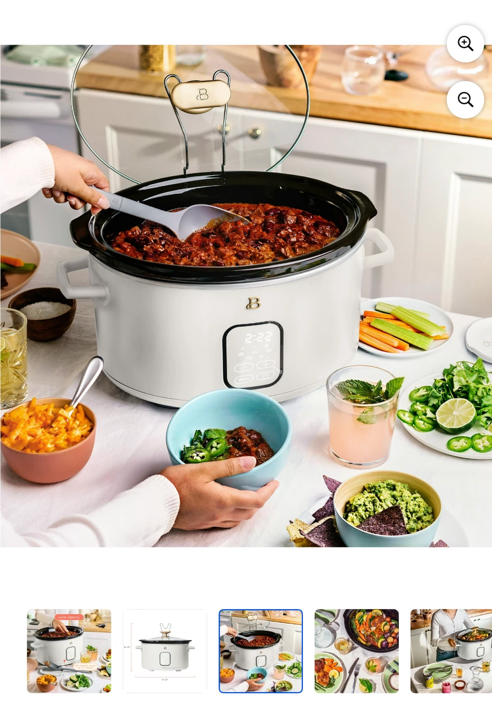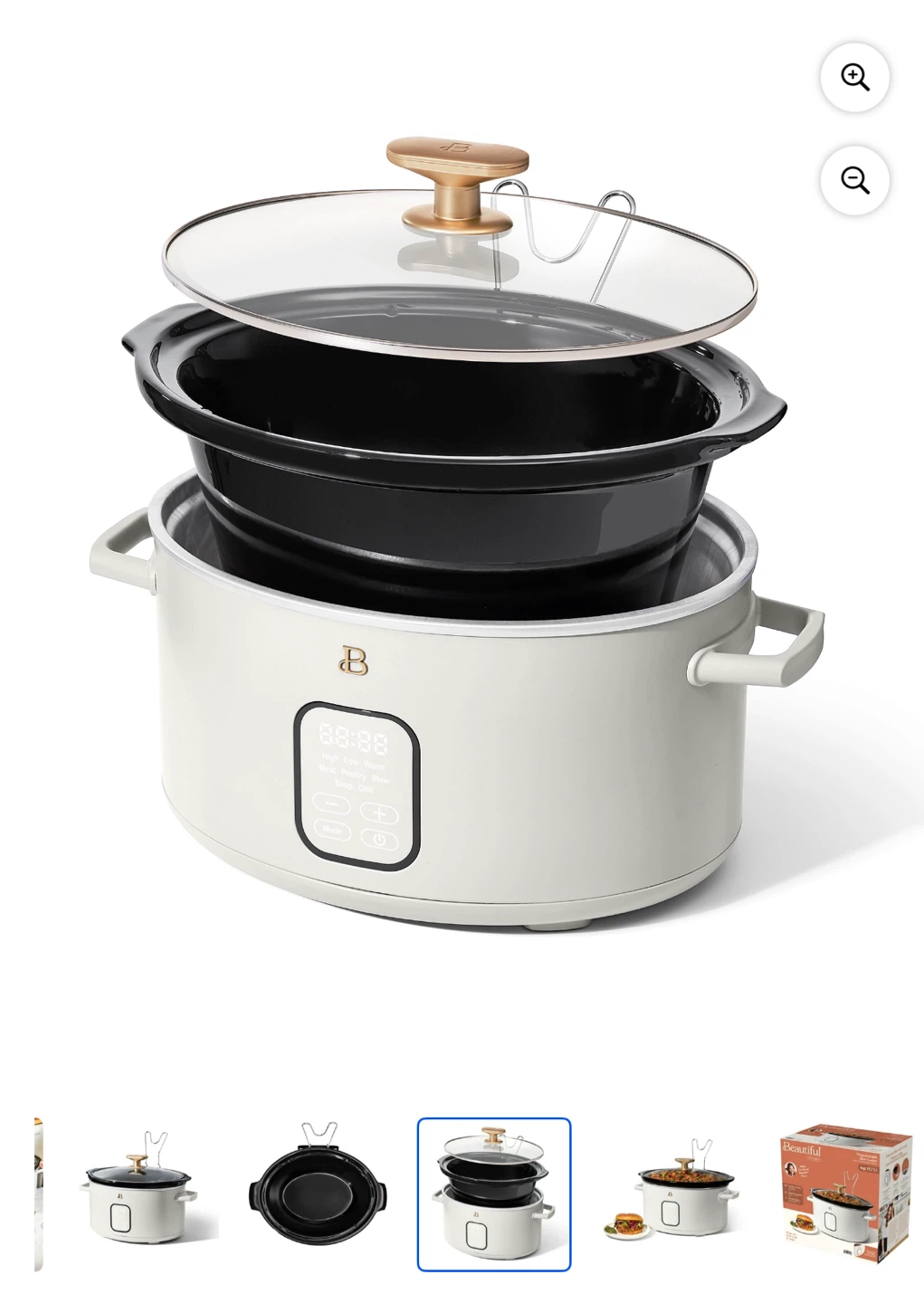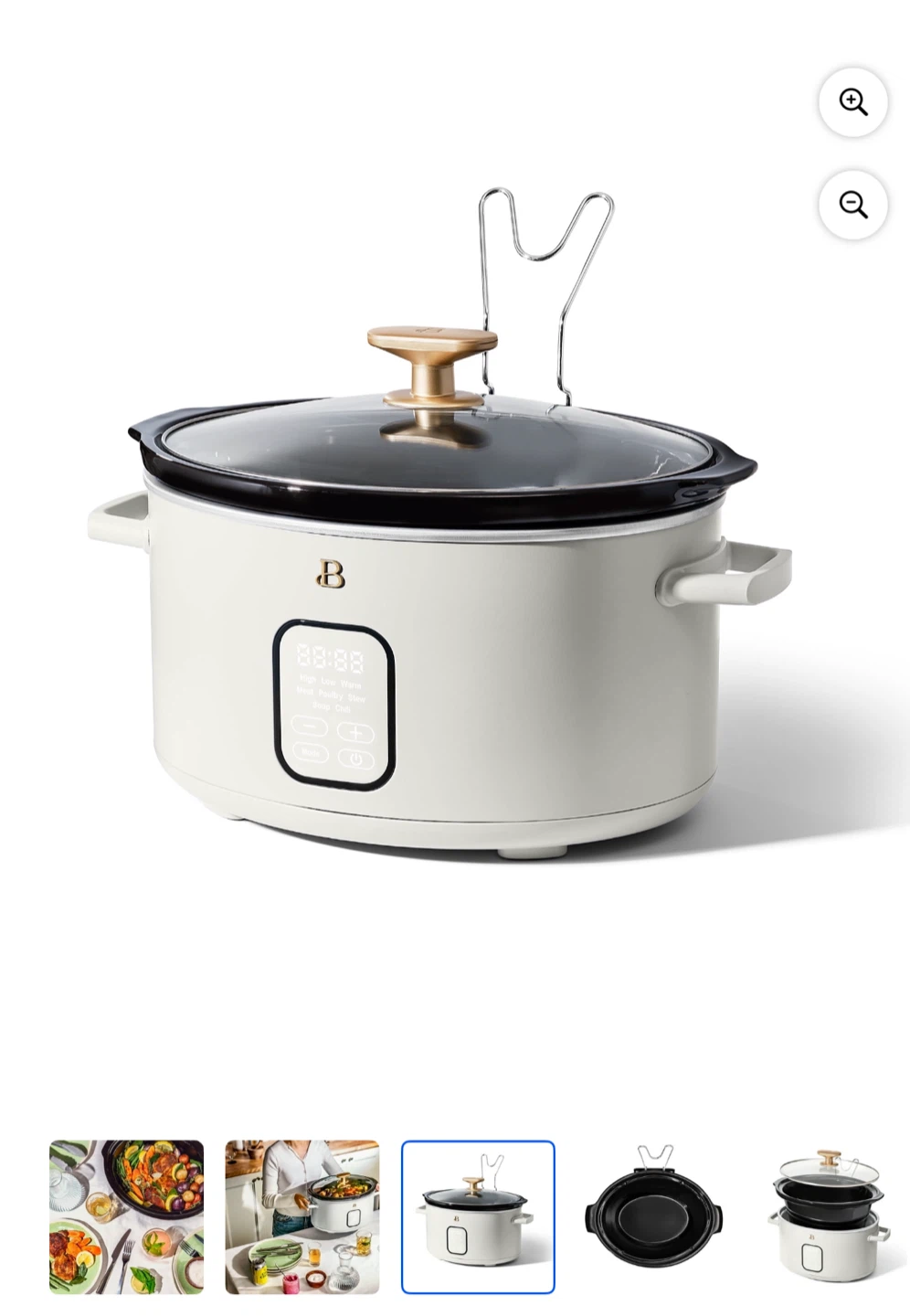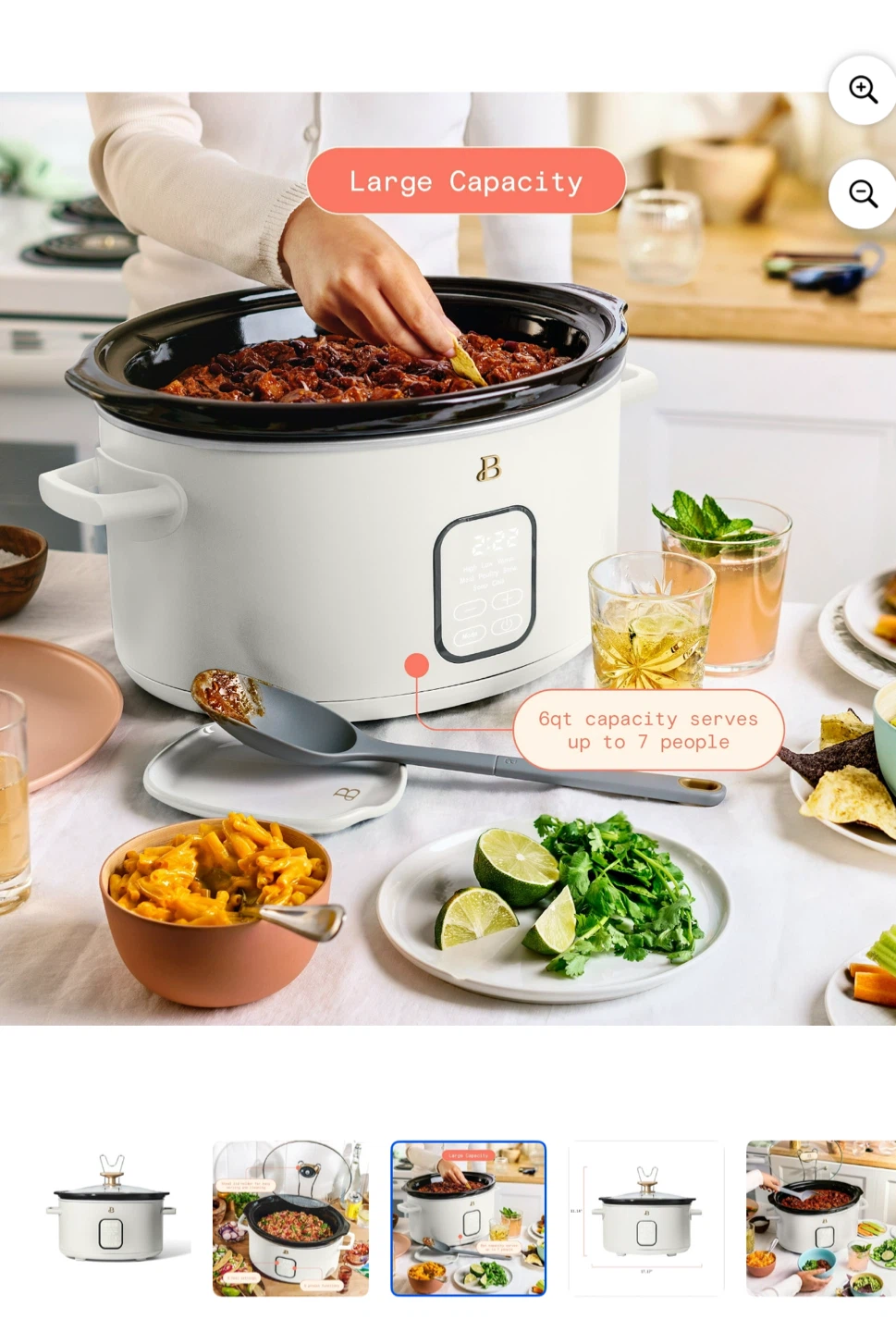 I'm selling a Beautiful Kitchenware 6-quart programmable slow cooker in the White Icing colour! This slow cooker has a touch-activated display and a large 6-quart capacity. It's perfect for preparing, setting, and enjoying slow-cooked meals. The dimensions are 17.17 inches in width and 11.14 inches in height. It also includes a steel lid holder.