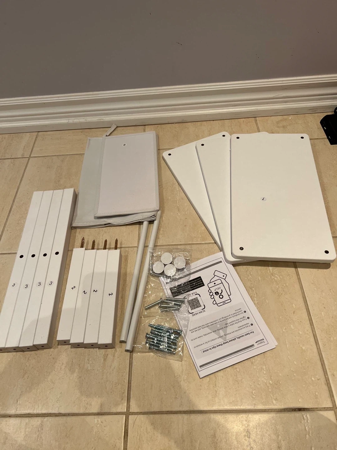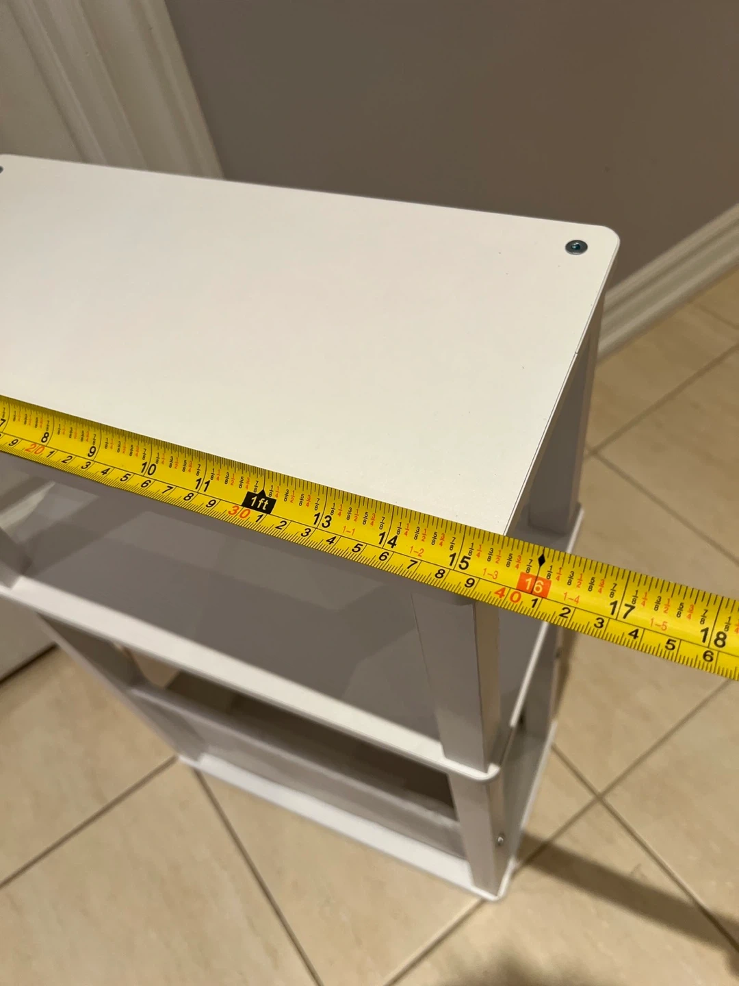 Here's a handy white storage shelf with three tiers! It's in great shape and ready to help organize your space. The height is approximately 26 inches.