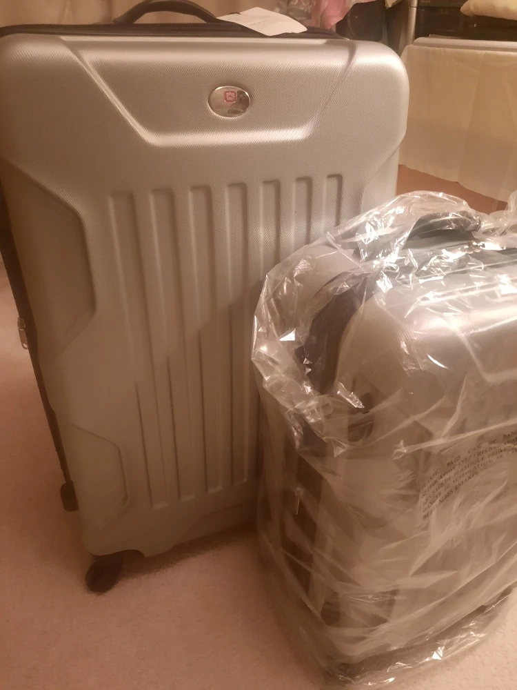 The smaller carry-on suitcase is still sealed in its original packaging. Perfect for your next trip!