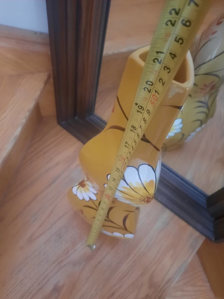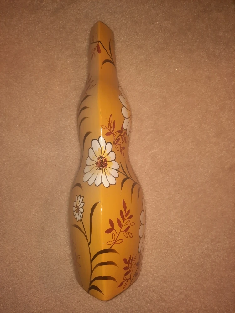 Here's a lovely yellow vase with a floral design! It would look great in any room and add a touch of warmth and charm. Place on the Floor/Shelf/Mantle as a decorative accent. Excellent for Corners. Approx height is 20.5". $10