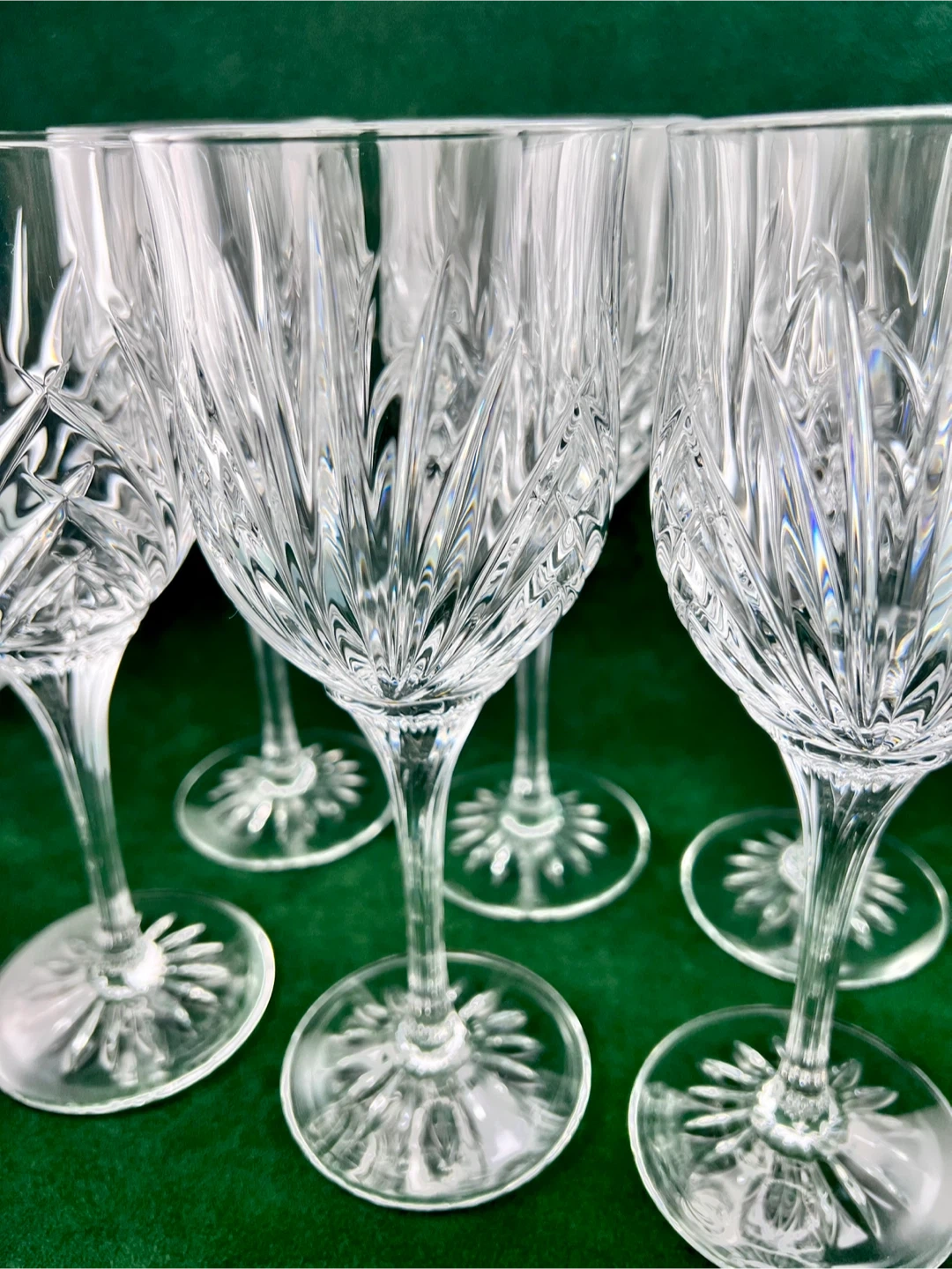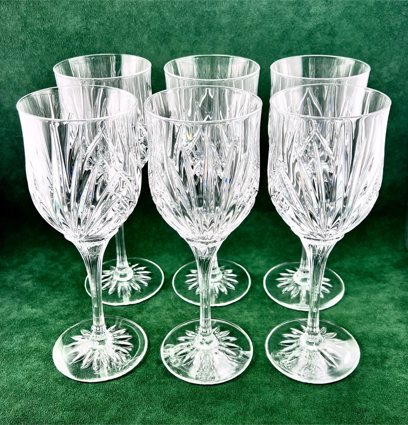 Set of 6 large fine crystal stemmed large water goblets. In mint condition— no chips, cracks or etching. Glasses measure 8.5” tall