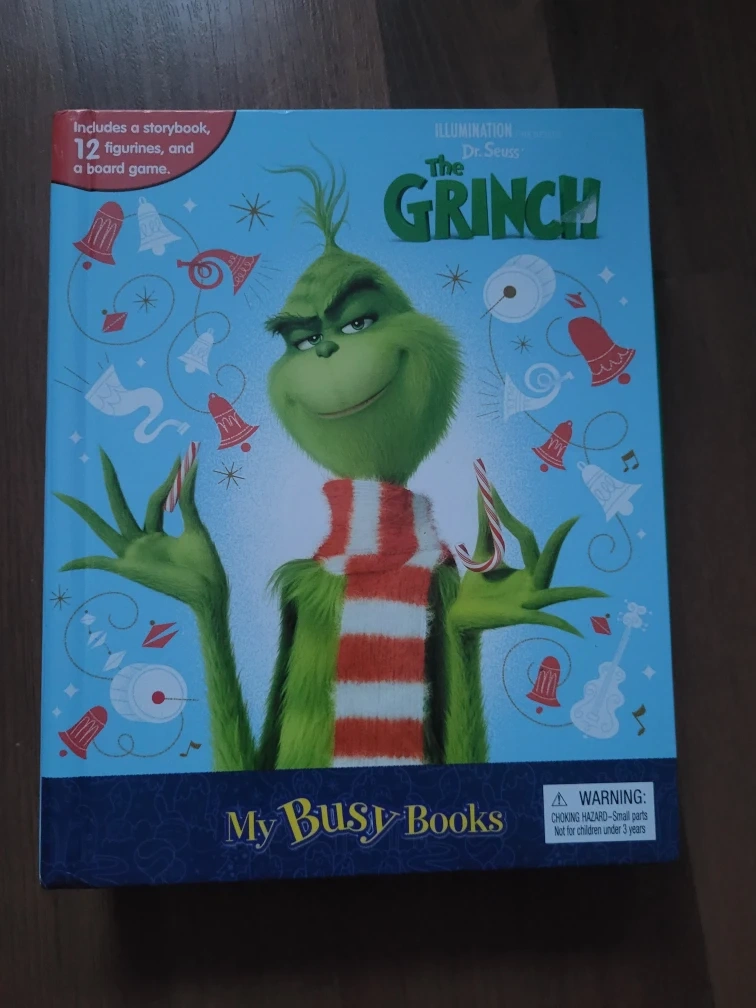 Selling The Grinch My Busy Books set! It includes a storybook, 12 figurines, and a board game. Recommended for ages 3 and up, it's a fun way to engage your child's imagination with full-page illustrations and a playmat that brings the characters to life