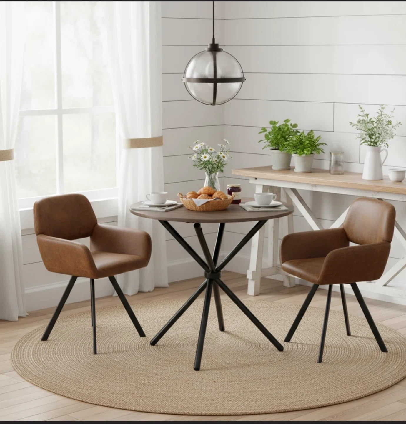 Here's a lovely dining table set that includes two chairs! The set features a brown colour and a modern design, perfect for a small dining area or kitchen nook. It's in great condition and ready to brighten up your space