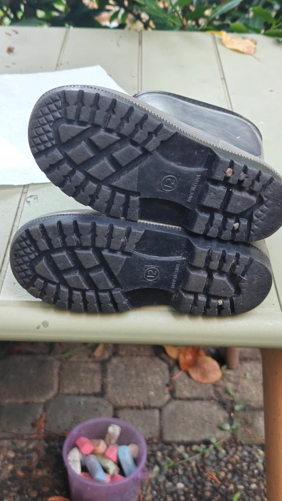Selling a pair of kids' winter boots in size 12. They're black with gold star designs and have a snowflake accent. Perfect for keeping little feet warm and dry this winter!