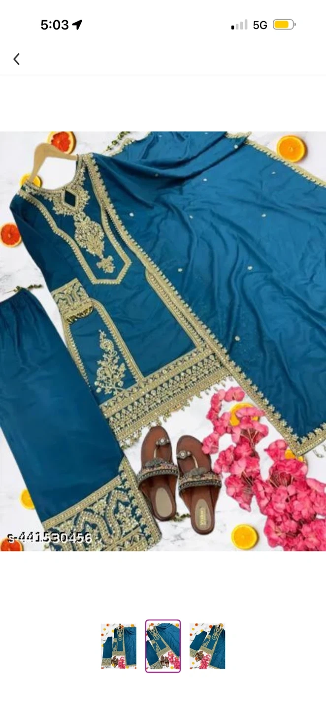 Buy & SellTeal Salwar Kameez SuitTeal Salwar Kameez Suit$60Beautiful teal salwar kameez suit with gold embroidery. Perfect for a special occasion!ConditionNewSizeLargeWHERE TO MEETCheck LocationView MapSELLERSimranNewton100 reviews0 chats·0 favorites·1 views