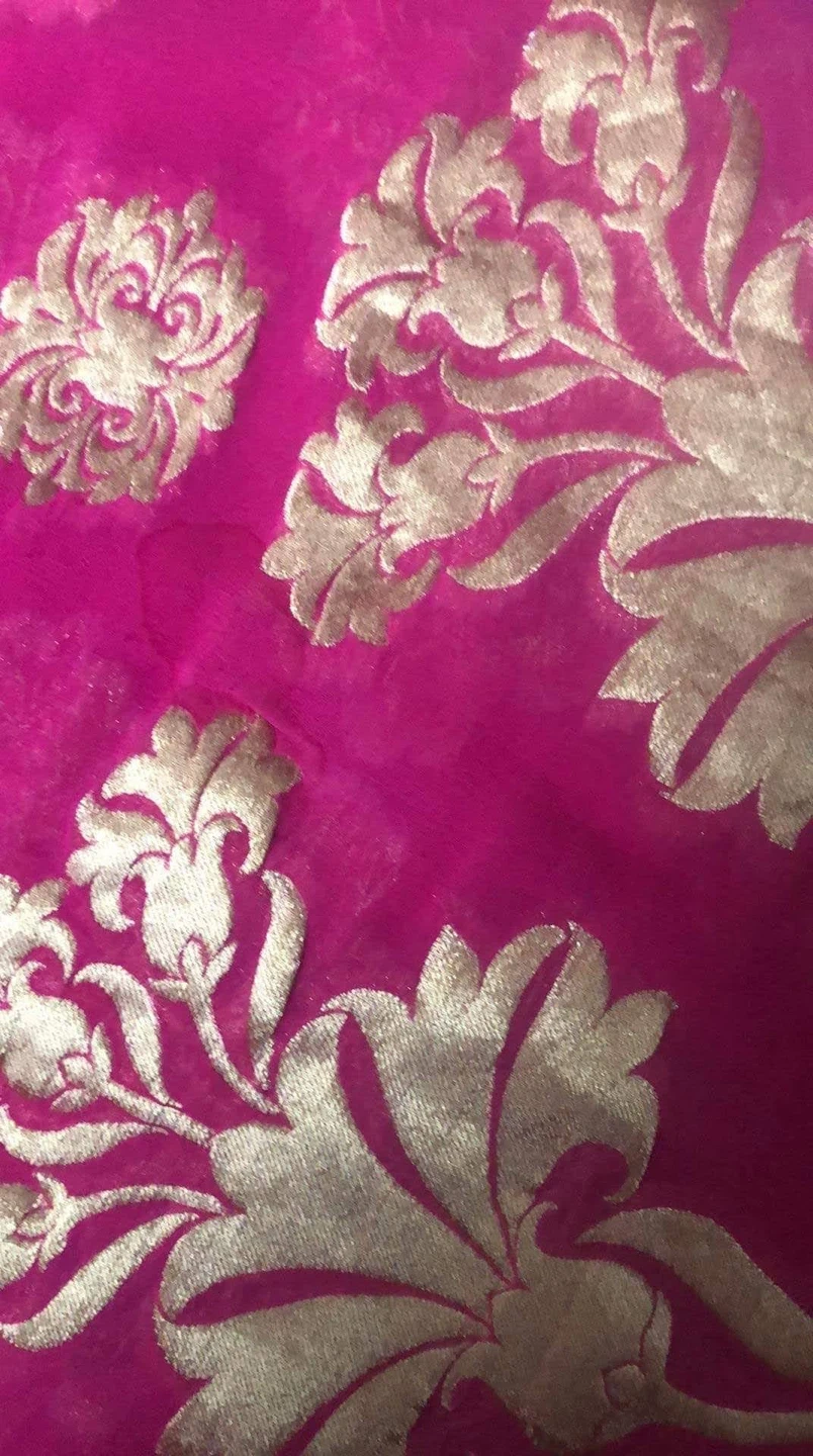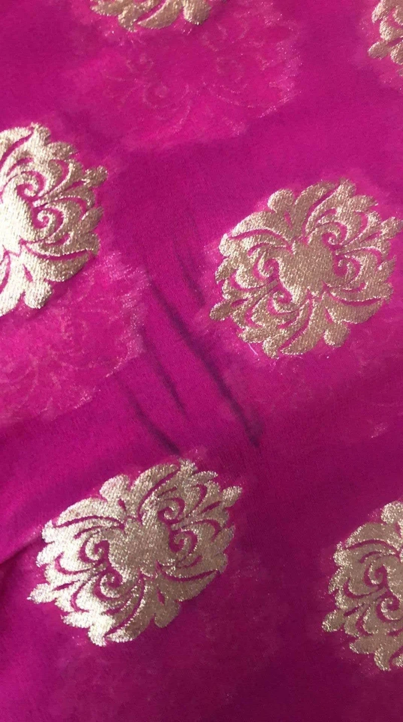 Selling a pink sari with gold detailing. It has some wear and tear, as shown in the photos. Still has lots of life left!