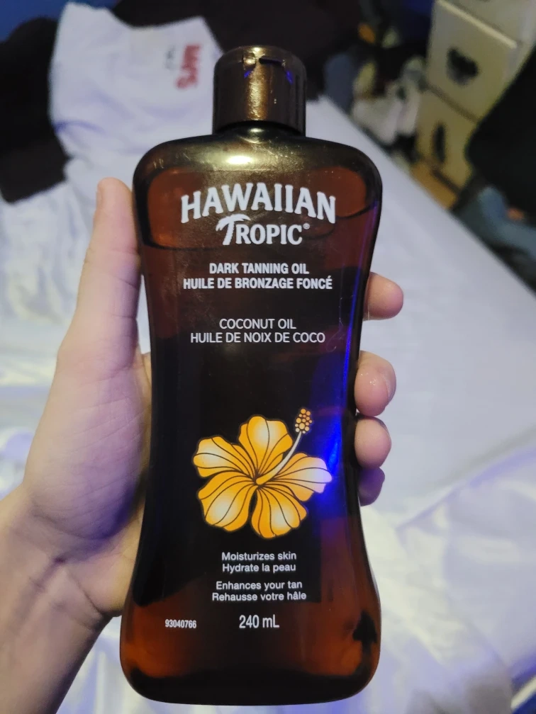 I'm selling a bottle of Hawaiian Tropic Dark Tanning Oil. It's a coconut oil formula that moisturizes skin and enhances your tan. The bottle contains 240ml of product It's completely full I used it 1 time and didn't really like it