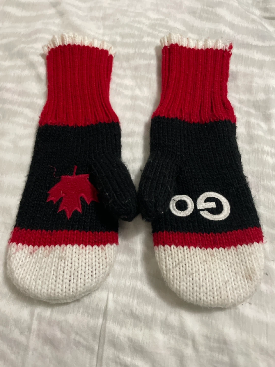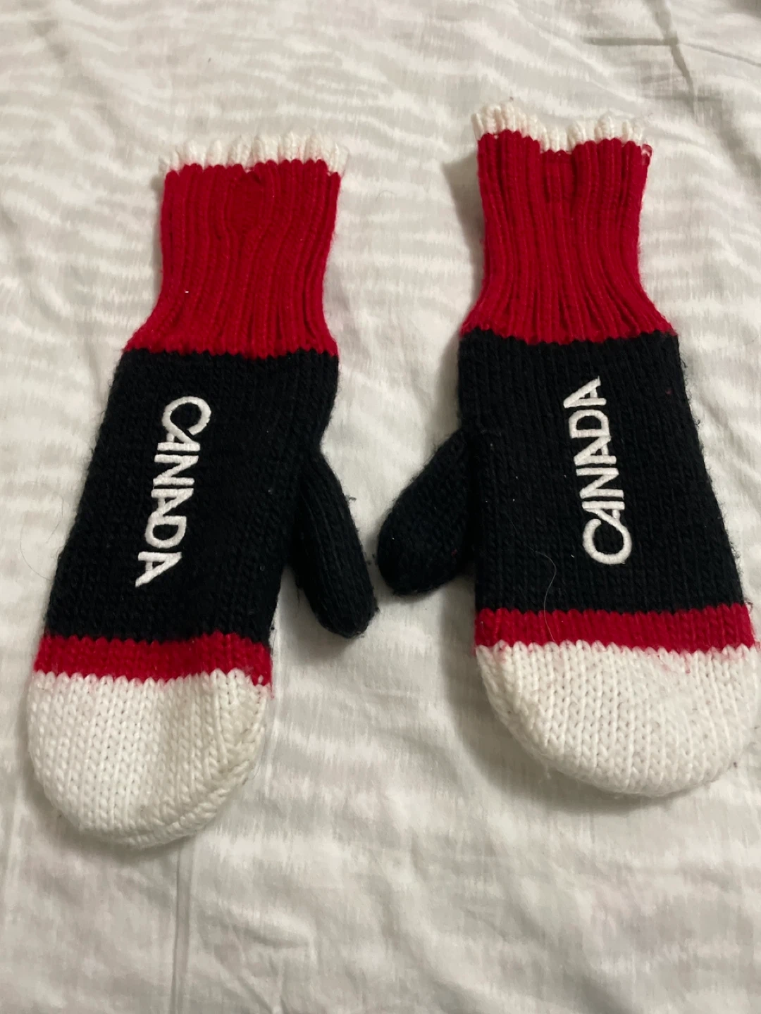 Keep your hands warm with these Canada Olympic mittens! They are size S/M and feature the Canadian flag and Olympic rings. The shell is made of 100% acrylic and the lining is 100% polyester