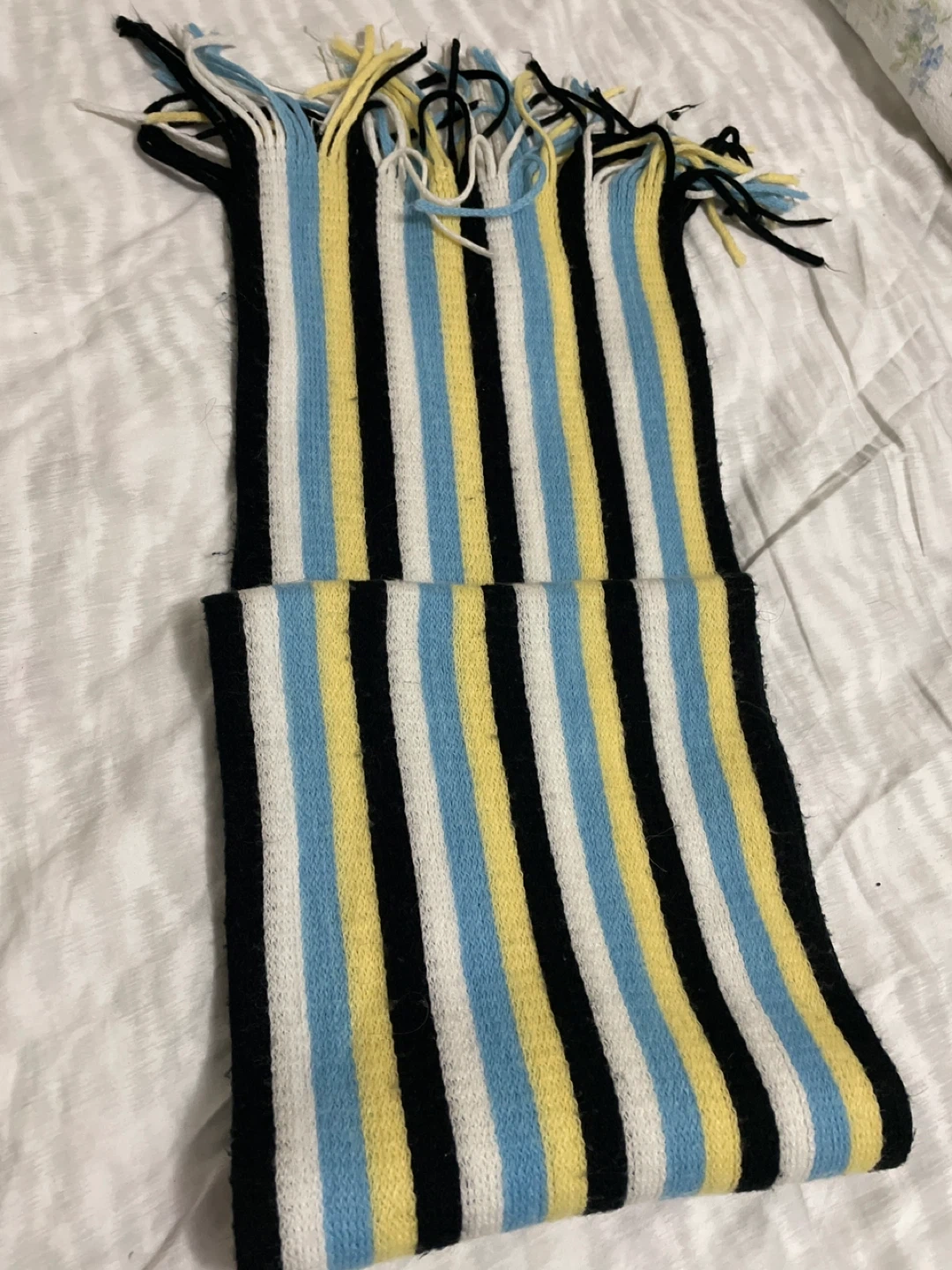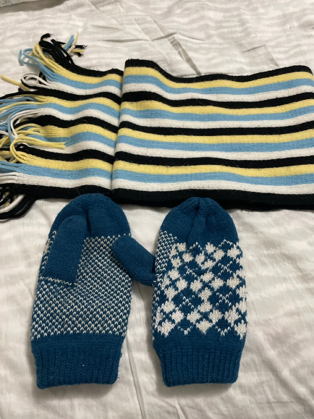 Selling a cozy mitten and scarf set! The mittens are a lovely blue and white patterned knit, and the scarf features stripes of black, white, yellow, and blue. Perfect for keeping warm during the colder months