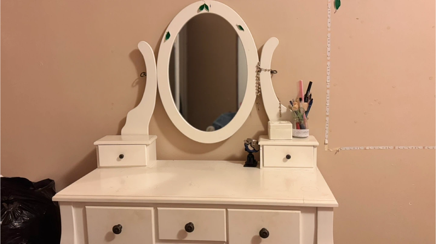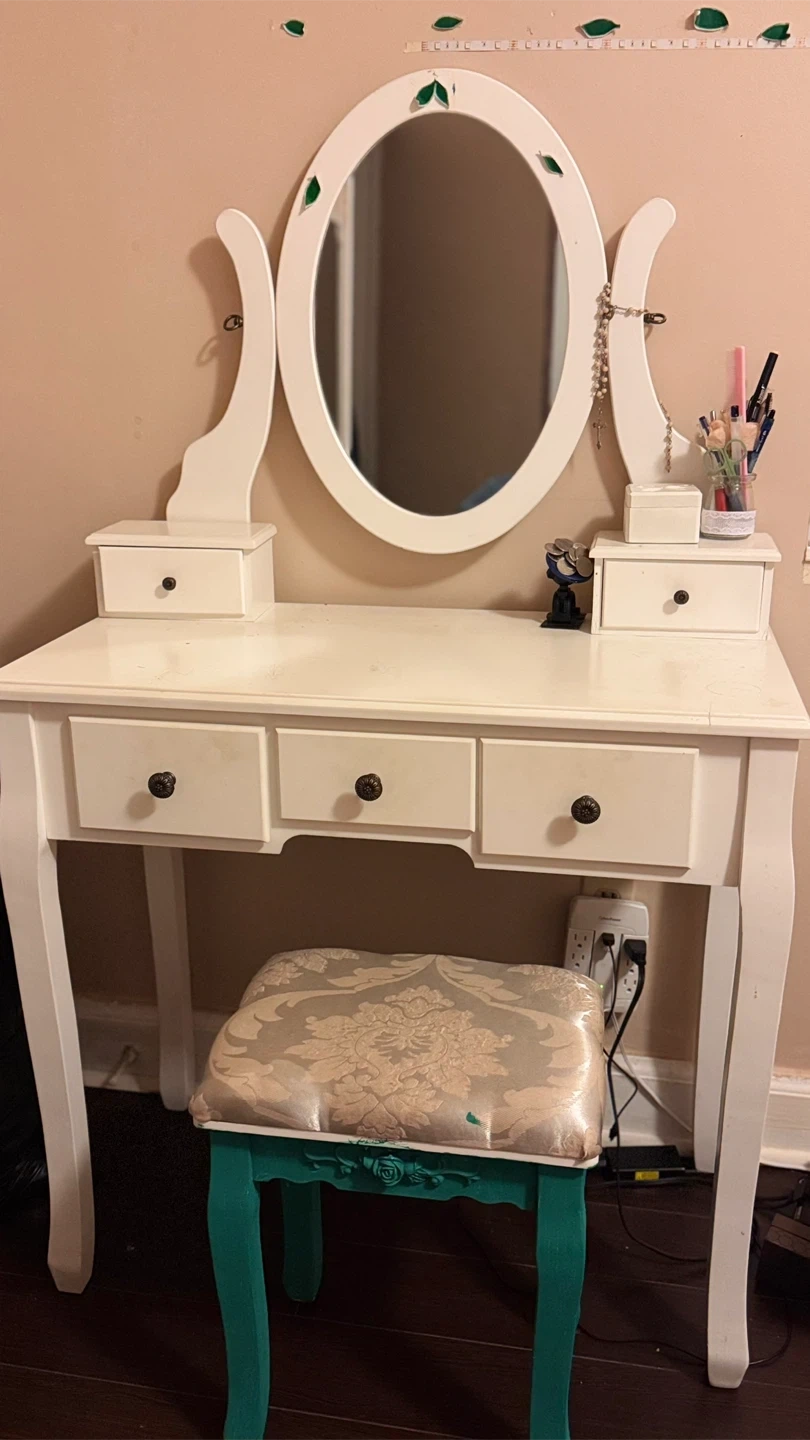 Selling a cute white vanity table! It comes with a mirror and a stool. Perfect for a bedroom or dressing area. It has some signs of use but is still in good condition!