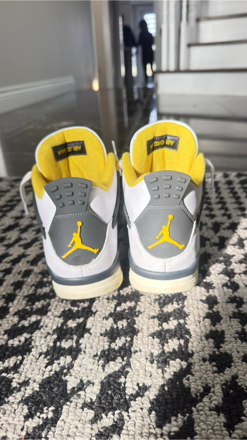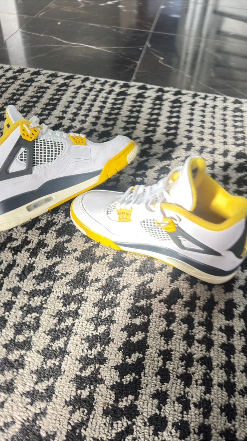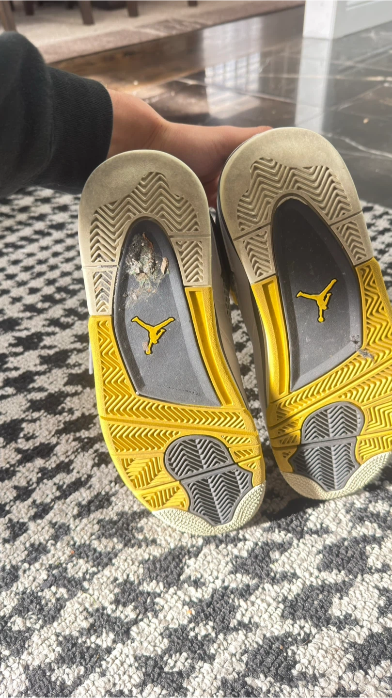 Real Jordan fours got them from a friend I traded an Apple Watch for these. These are 100% real and only worn once the bottom is just dirty. The insole is not faded or anything perfect for a Christmas gift for anybody I do not have the original box but if you want to have another Jordan four box