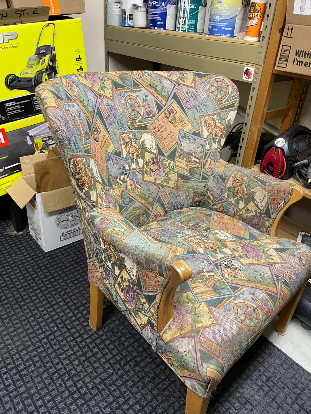 Selling a vintage armchair with a unique floral and postcard pattern. It's perfect for adding a touch of retro charm to any room. The wooden armrests and legs give it a sturdy feel. Some wear and cat scratches in upholstery but easily hidden with a throw blanket.