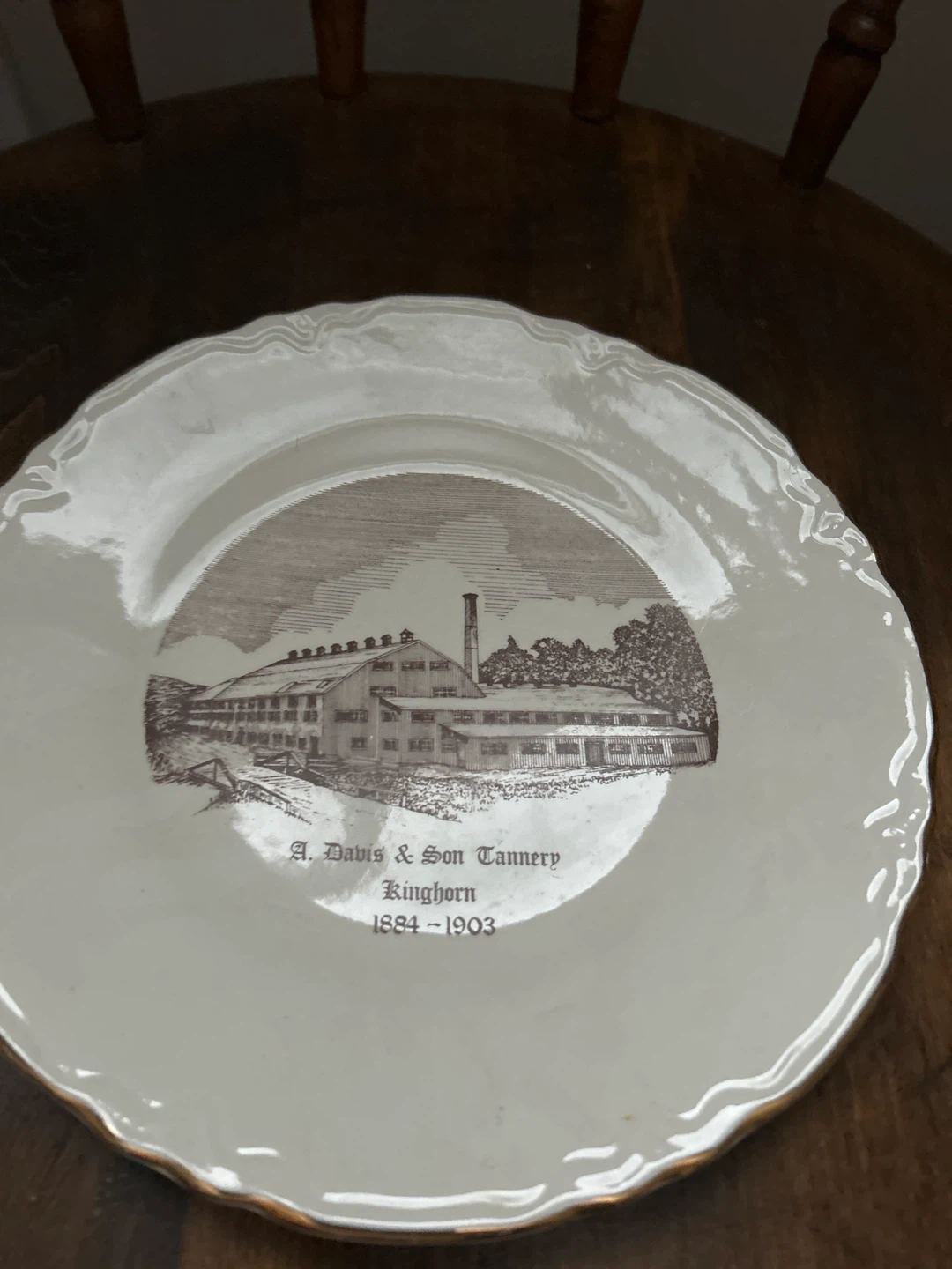 Selling a vintage Can Art China plate featuring a design of the A. Davis & Son Tannery in Kinghorn, dating from 1884-1903. It says "Decorated in Canada" with a maple leaf and "Made in Gold". It's a lovely piece of Canadian history for any collector!