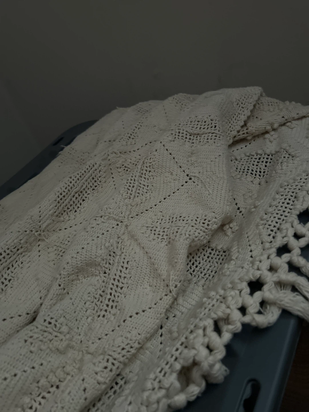 Selling a cozy off-white knit throw blanket! It's in great condition and would be perfect for adding some texture to your living space or bedroom. The knit pattern is really pretty, and it has some nice fringe detailing too