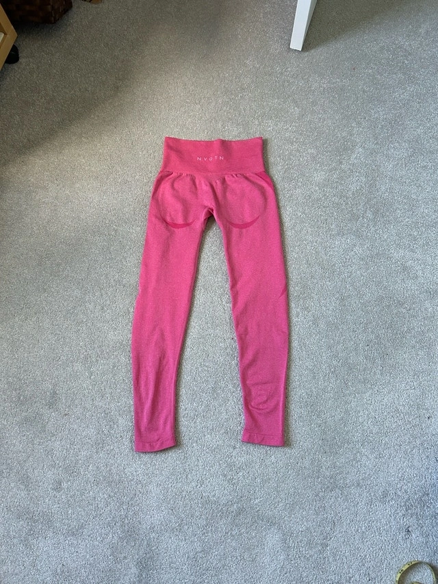 These are a pair of NVGTN leggings in size extra small, perfect for workouts or casual wear. The leggings are in good condition, showing minimal signs of wear. They feature a high waistband and a comfortable, stretchy fabric blend of 87% nylon and 13% spandex.