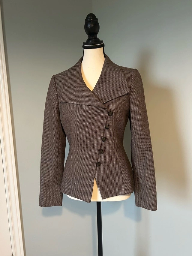 Tahari Arthur S. Levine Asymmetrical Wool Blazer. Excellent pre-owned condition with a very faint smell of perfume. Elevate your professional or casual wardrobe with this stunning and unique blazer. The tailored fit and asymmetrical design make it a modern and stylish statement piece. Key Features: - Style: Tailored blazer/jacket with a slightly peplum or fitted silhouette that flatters the waist. - Closure: Unique asymmetrical button closure running diagonally across the front. - Collar: Modern, wide, notched lapel/collar. - Fabric (Shell): Luxurious 100% Wool shell. - Color/Pattern: Fine brown and black micro-dot or subtle tweed pattern. - Lining: Fully lined with a silky animal/leopard spot print (100% Polyester). - Versatility: Perfect for the office, business casual events, or pairing with jeans. Details from Tag: - Brand: Tahari Arthur S. Levine - Size: 4 - Shell: 100% Wool - Lining: 100% Polyester - Care: Dry Clean Only Approximate Flat Measurements (taken buttoned): - Shoulder to Shoulder: 15.5” - Pit to Pit (Bust): 18” - Waist: 16” - Length: 24” - Sleeve Length: 23.5” Comes from a smoke-free home.