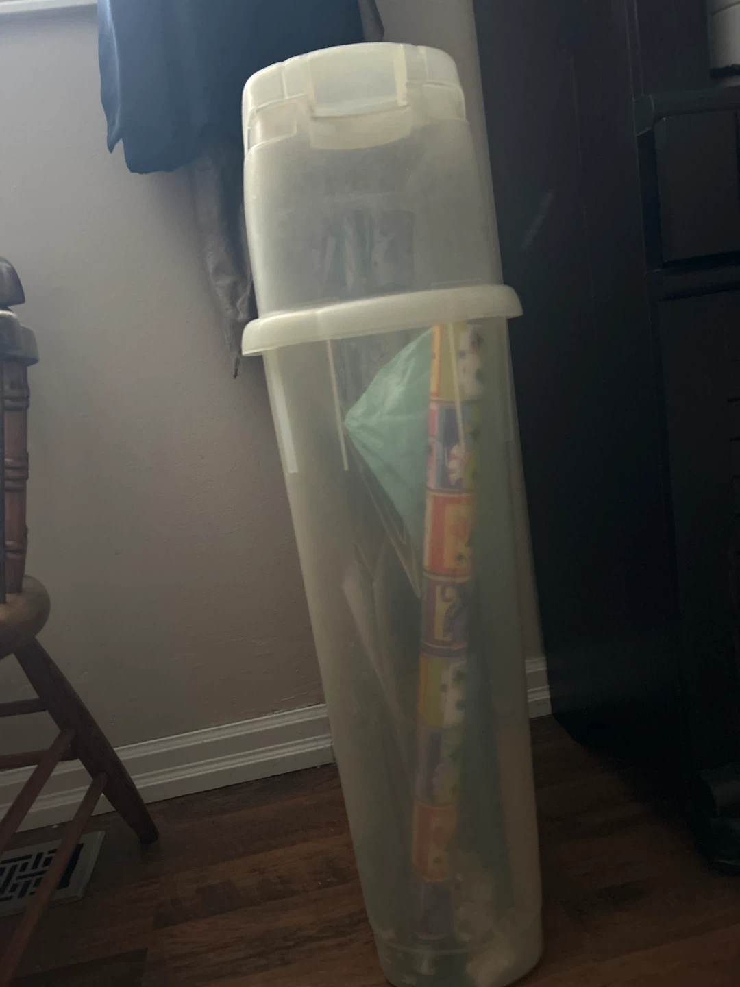 Selling a Rubbermaid Wrap 'n Craft gift wrap storage container. It's perfect for storing tape, scissors, ribbon, and more! It can fit up to 20 rolls of wrapping paper. Dimensions are 17.1 x 10 x 33.3 in / 43.2 x 25.2 x 84.7 cm