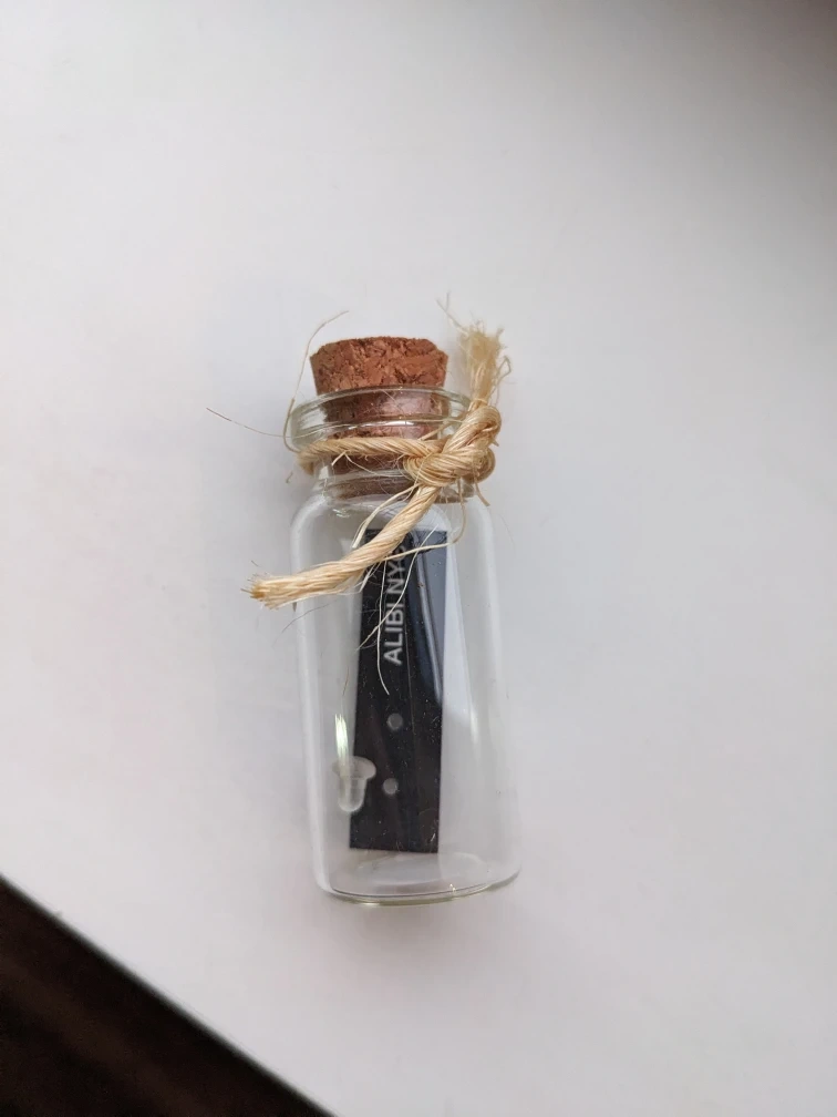 A small glass bottle with a cork stopper, tied with a bit of twine.