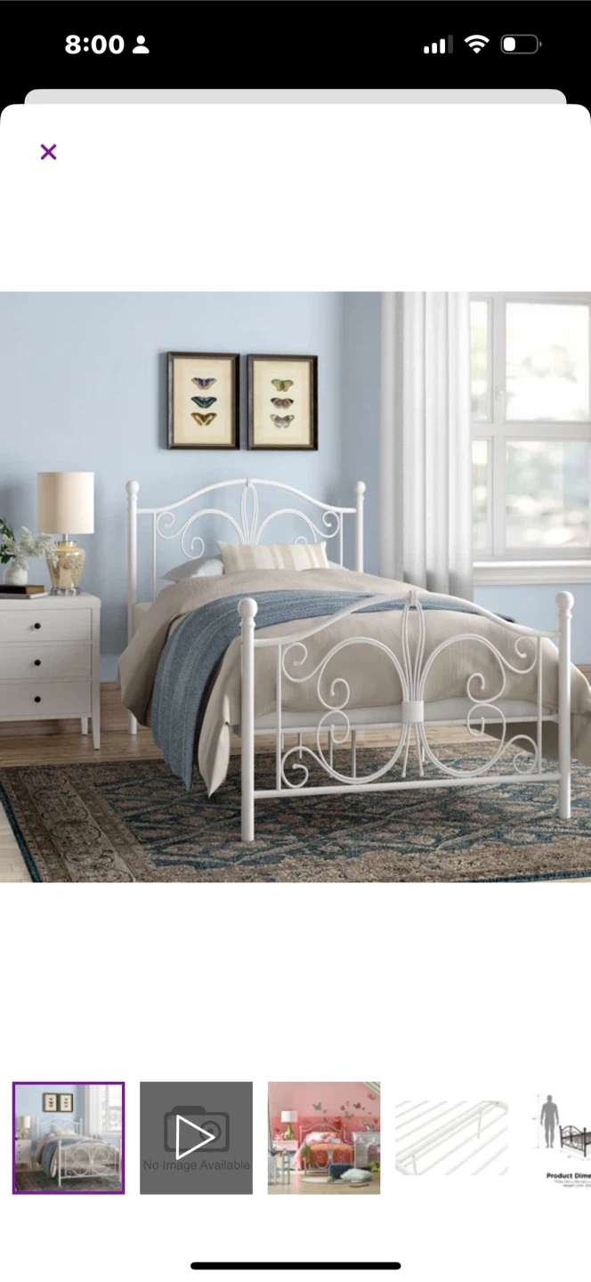 Selling a white metal bed frame in full size. The product dimensions are 77.5 inches (W) x 41 inches (D) x 41.5 inches (H). The weight limit is 250 lbs. It's in good condition and ready to go! No mattress included.