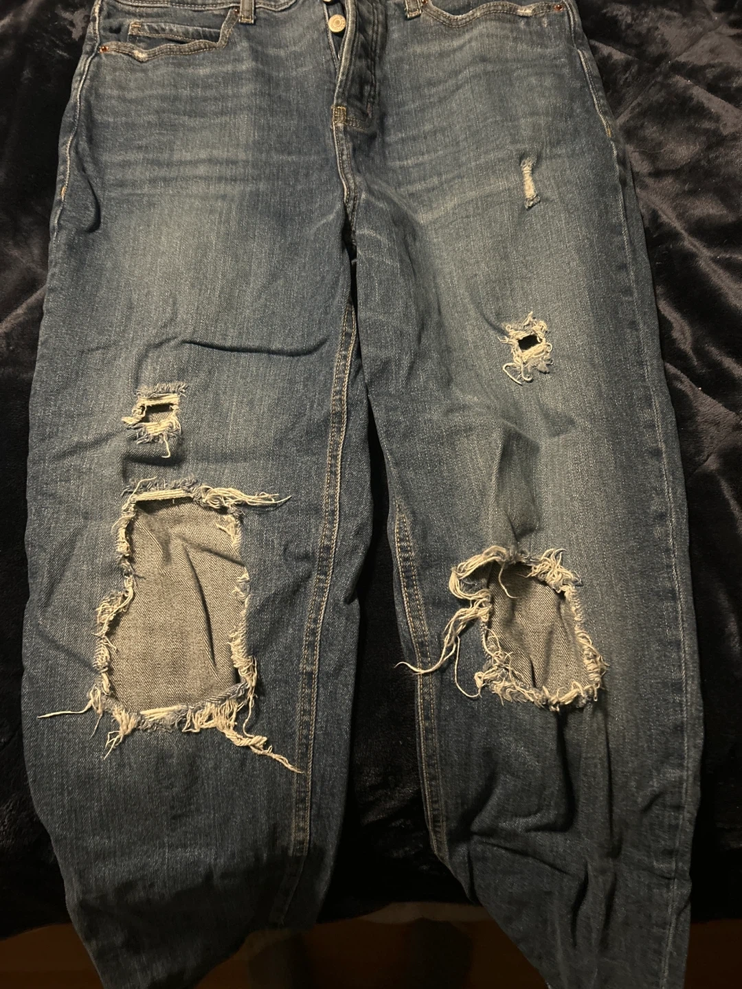 Selling a pair of Old Navy jeans in size 10. They have a button-up fly and a straight leg fit. These jeans are ripped and distressed, giving them a unique look!