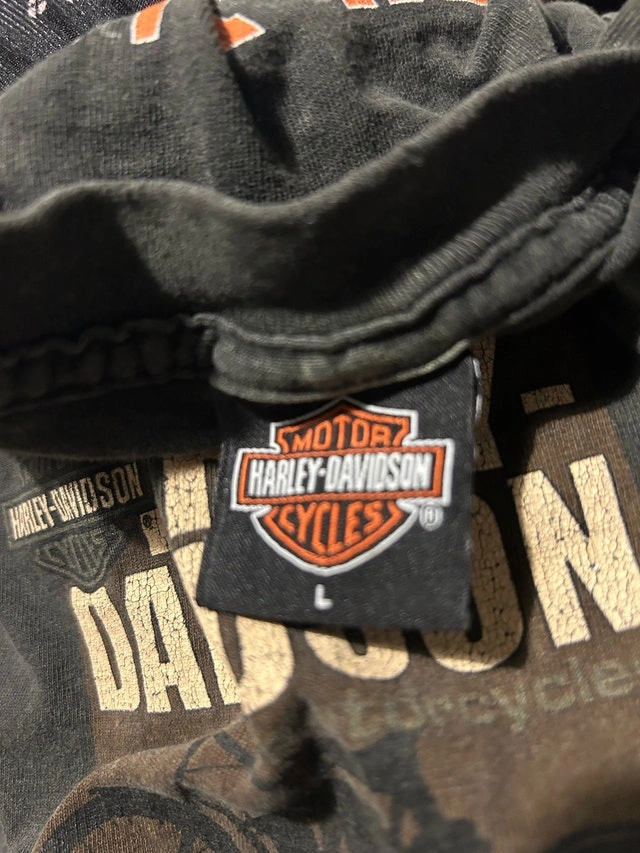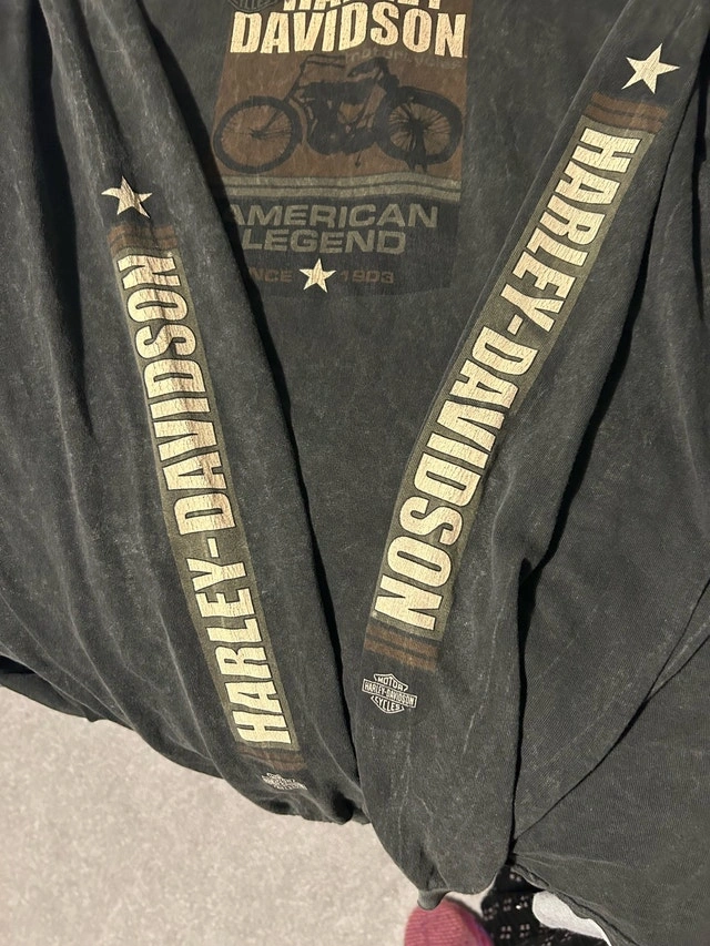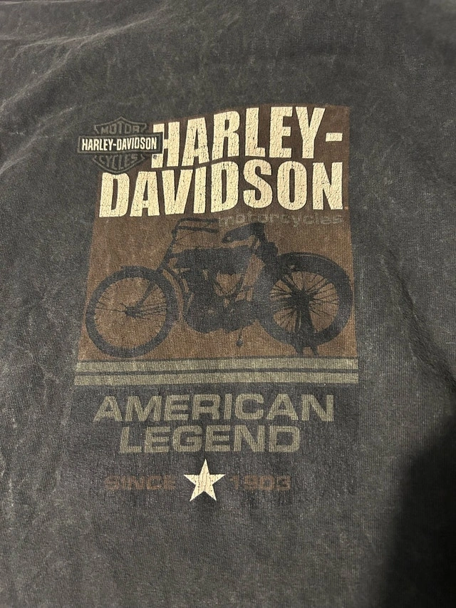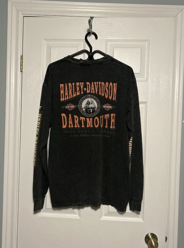 VINTAGE 90s HARLEY-DAVIDSON. SIZE: L P2P: 24 inches Sleeves: 25 inches Length: 29 inches ERA: Estimated 1990s COLOR: Faded Black / Charcoal Gray This is an authentic vintage Harley-Davidson long sleeve t-shirt, featuring a collectible graphic from the Dartmouth, Nova Scotia dealership. The shirt has a fantastic, naturally faded black/charcoal patina and a super soft, worn-in feel that vintage lovers search for. Front Graphic: Features the classic "Harley-Davidson American Legend" winged graphic. Back Graphic: Dealer print for DARTMOUTH, NOVA SCOTIA, CANADA. Sleeve Graphic: HD graphic runs down both sleeves. Condition & Flaws (Priced Accordingly): This shirt is in true distressed vintage condition, perfect for someone who loves the worn-in, "lived-in" aesthetic. All flaws are consistent with age and are disclosed below: Holes in Pits: There are a few small holes (pin-sized to pencil-eraser-sized) in the fabric on the seam of each armpit. These are minor and can be easily reinforced or left as-is for the distressed look. Fading/Discoloration/Graphic Cracking: The main graphics on the front, back, and sleeves show cracking and light peeling consistent with a shirt of this age. Sleeve Date Fading: The specific year printed on the sleeve is highly faded and illegible (appears to be a 199* date). Overall: A rare and highly sought-after dealer shirt with the perfect vintage road-worn look. Grab this unique Canadian Harley piece!
