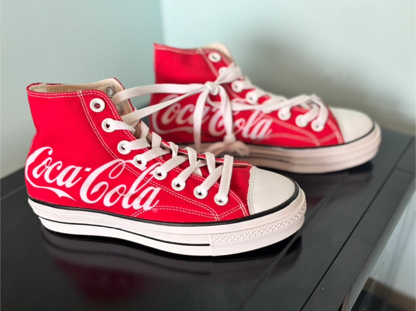 Selling a pair of high-top sneakers in a vibrant red colour, featuring the Coca-Cola logo. They're in great condition and ready for a new adventure! The size is Women's 7 / Men's 5.