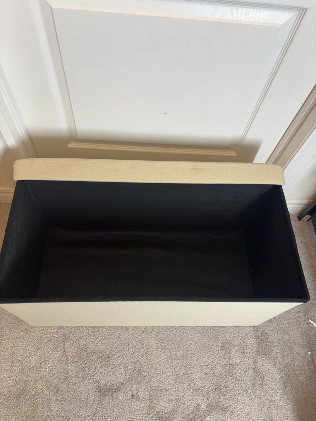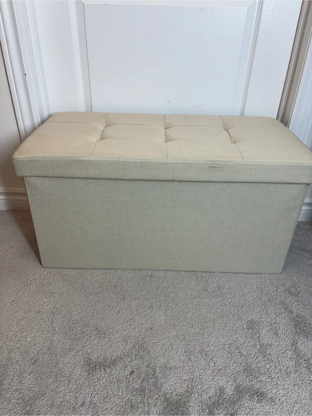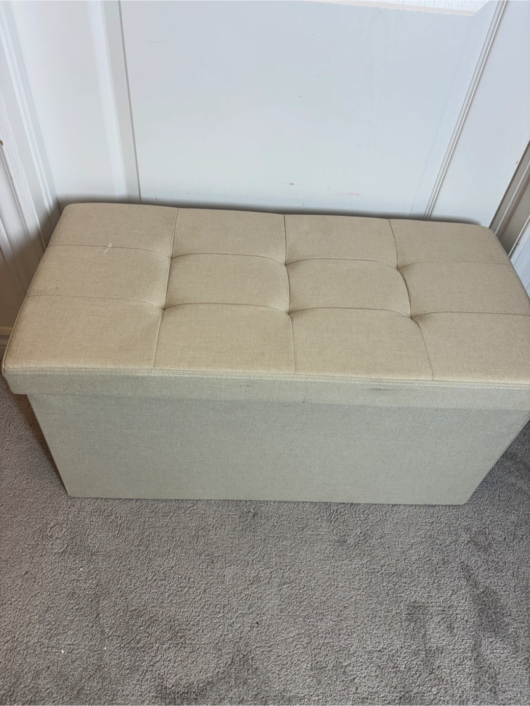 This beige storage ottoman bench is in great condition. It's perfect for adding extra seating and storage to any room. The dimensions are approximately 76 cm (28.9") in length, 38 cm (14.9") in width, and 38 cm (14.9") in height. It can hold up to 300 kg.