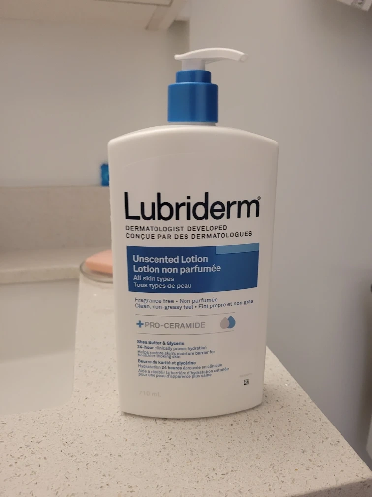 I'm selling a bottle of Lubriderm Unscented Lotion. It's dermatologist developed and designed for all skin types. It's also fragrance-free and has a non-greasy feel. It contains pro-ceramide, shea butter, and glycerin for 24-hour clinically proven hydration. The bottle contains 710 ml of lotion