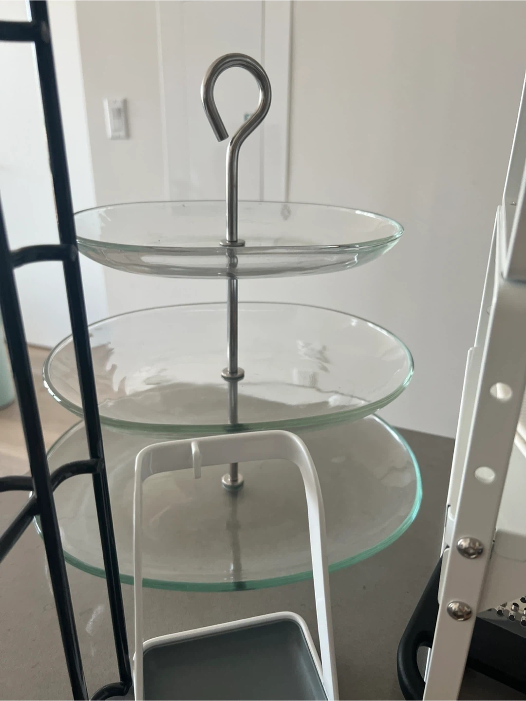 - Three-tier glass serving stand (clear glass / stainless steel)