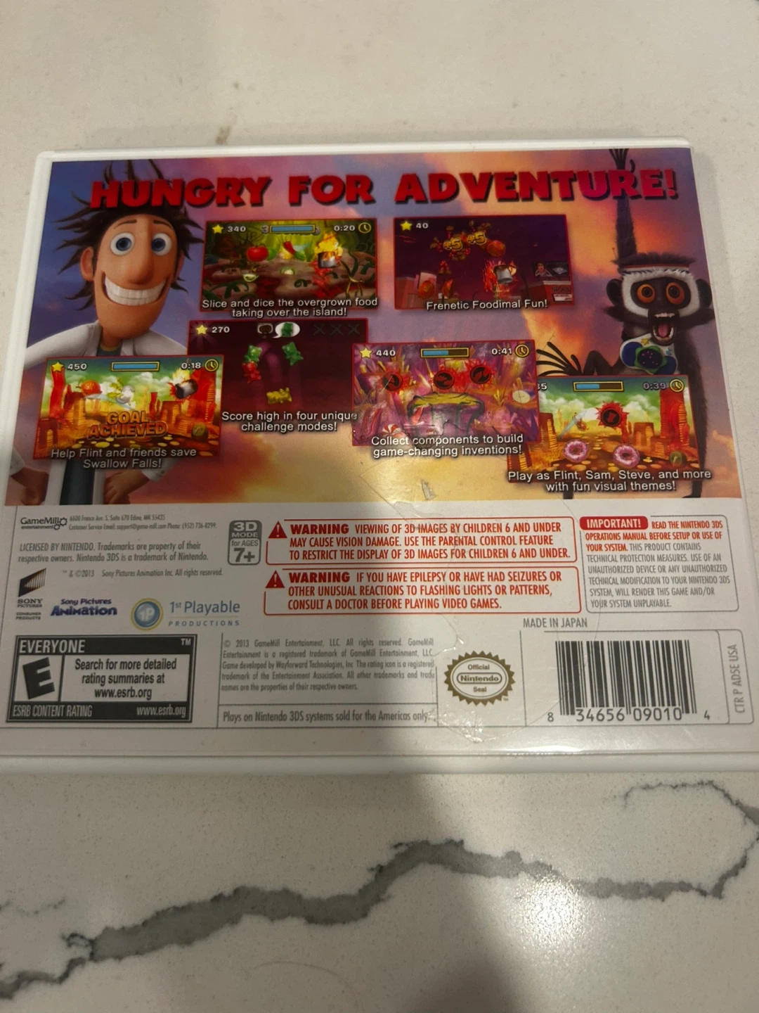 Selling Cloudy with a Chance of Meatballs 2 for the Nintendo 3DS! It's in great shape and ready for a new player. This game is rated E for Everyone and is playable in 2D and 3D modes for ages 7 and up. Get ready for a food-filled adventure!