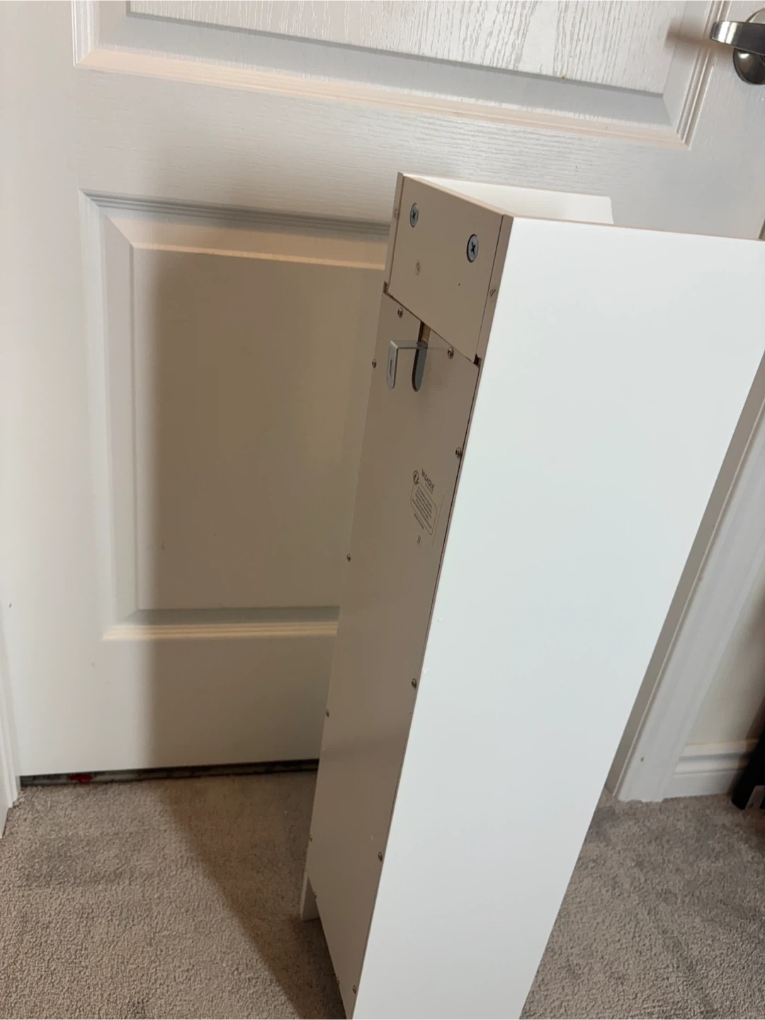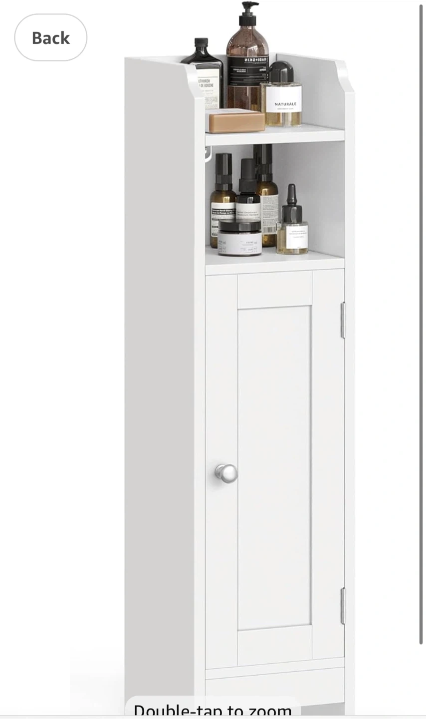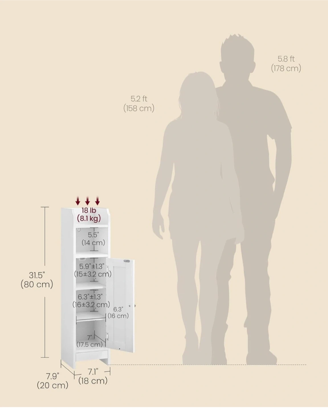 Selling a slim bathroom storage cabinet in white. It's perfect for smaller spaces! The dimensions are approximately 31.5" (80 cm) tall, 7.9" (20 cm) wide, and 7.1" (18 cm) deep. It features open shelves on top and a cabinet with a door below. Great for keeping your bathroom essentials organized