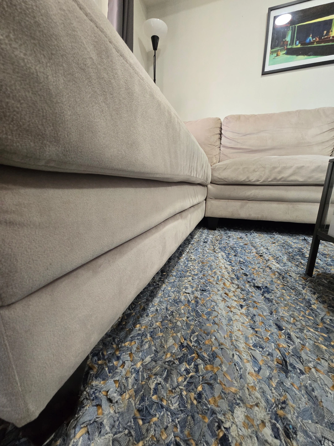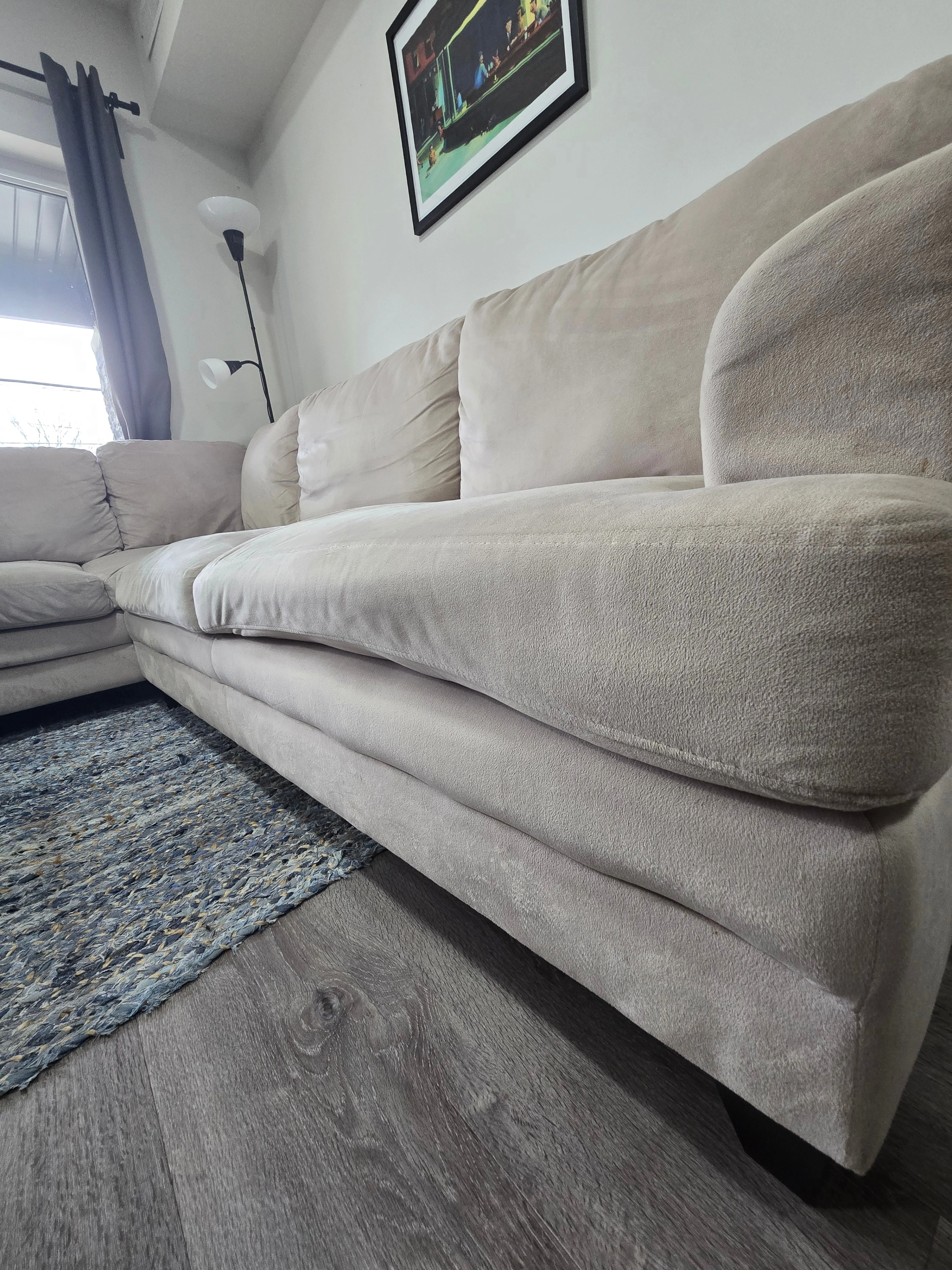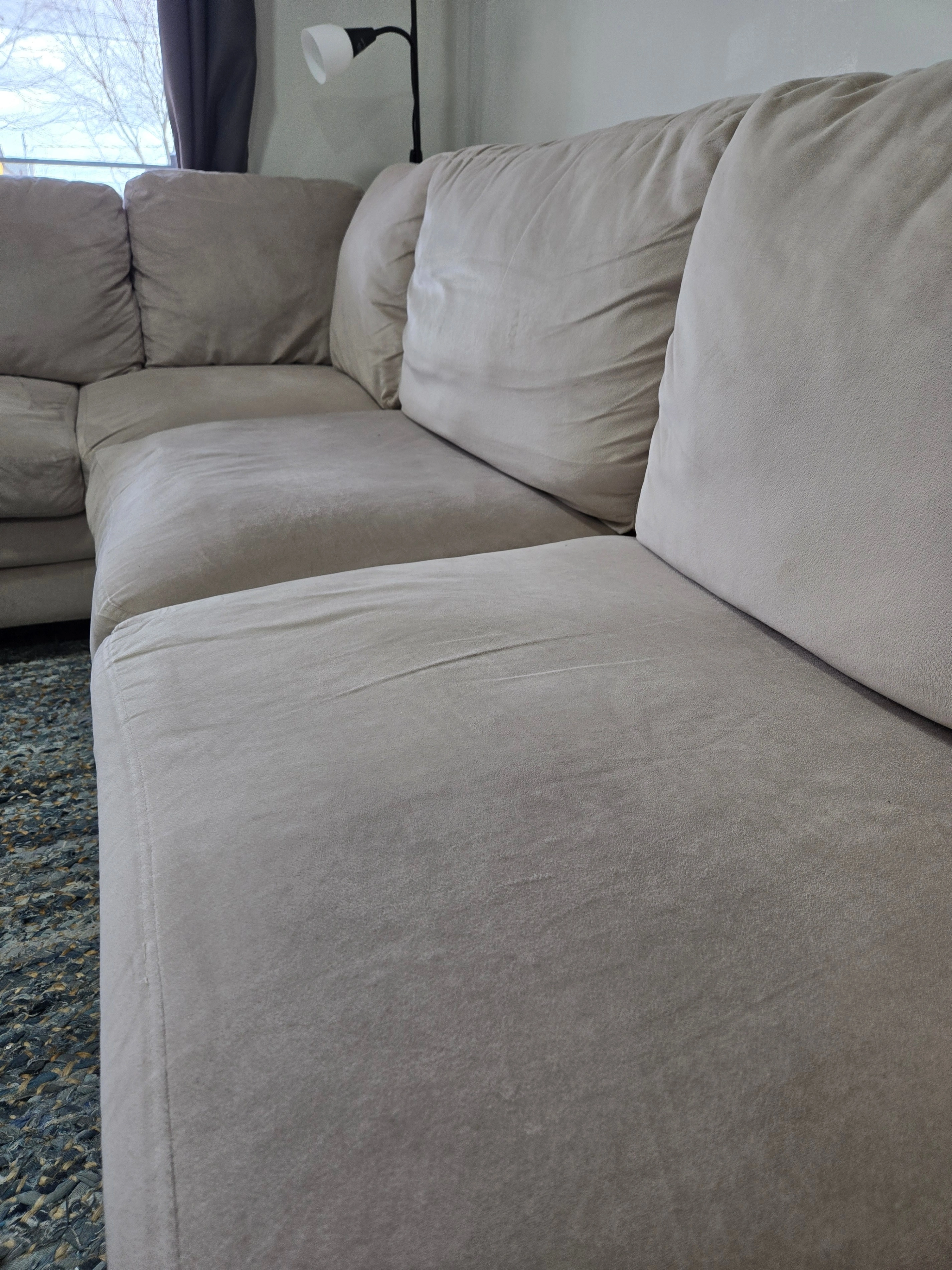 Selling a Comfortable 5-seater L-shaped couch in a soft cream colour. The sofa separates into two pieces at the corner and features a smooth, velvet-like fabric that’s soft to the touch.