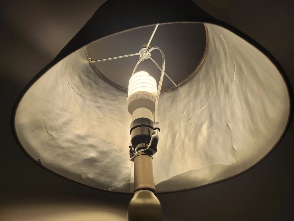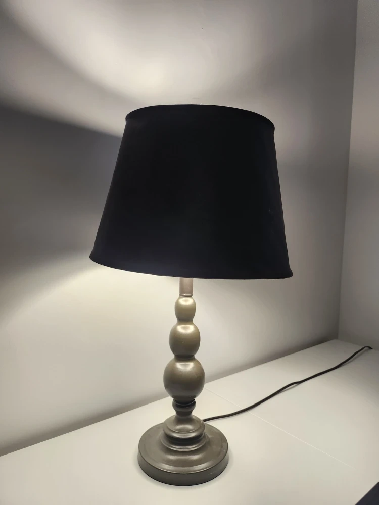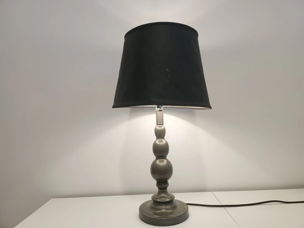 Here's a table lamp with a black lampshade and a decorative base. It's in great shape and ready to brighten up your space! This lamp would be perfect for a bedside table, desk, or living room side table
