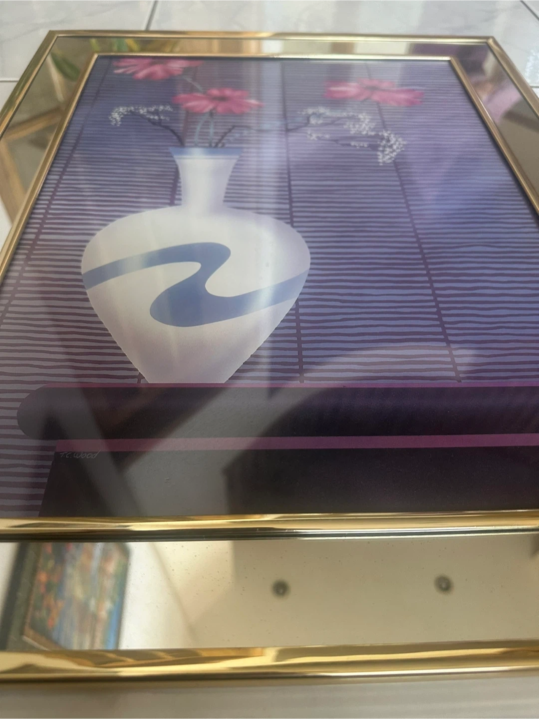 vintage 80s graphic art. Mirror frame with gold trim. 20”X16” Flower in vase. Minimal stylized graphic art. T.C. Wood print for $50