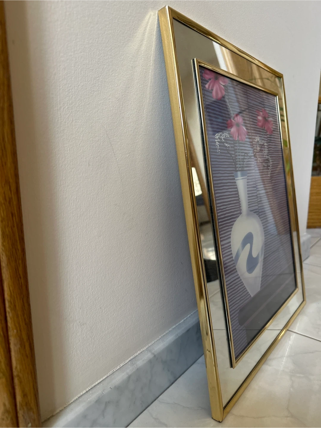 Selling a framed print featuring a floral vase design. The frame is a reflective gold mirror, adding a touch of elegance to any room.