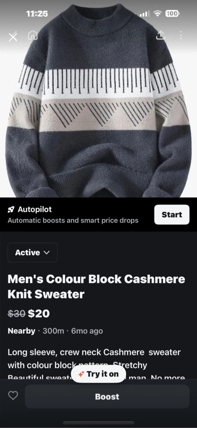 Selling a men's colour block cashmere knit sweater. It features a long sleeve and crew neck with a colour block pattern. It's also stretchy!