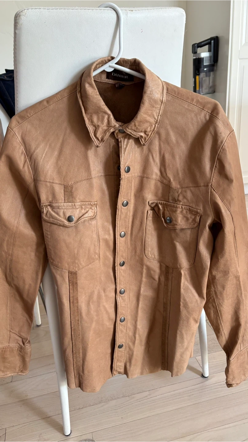 Here's a stylish Danier leather shirt in a size medium! It features a button-up design and a classic look. The leather has a nice, worn-in feel. It's perfect for adding a touch of ruggedness to your wardrobe!