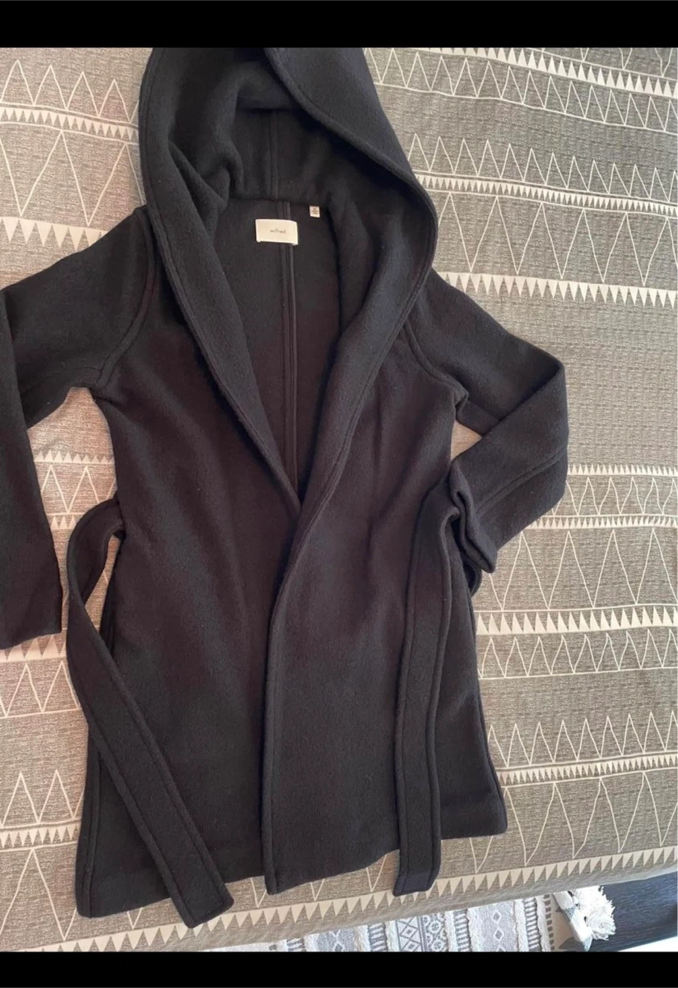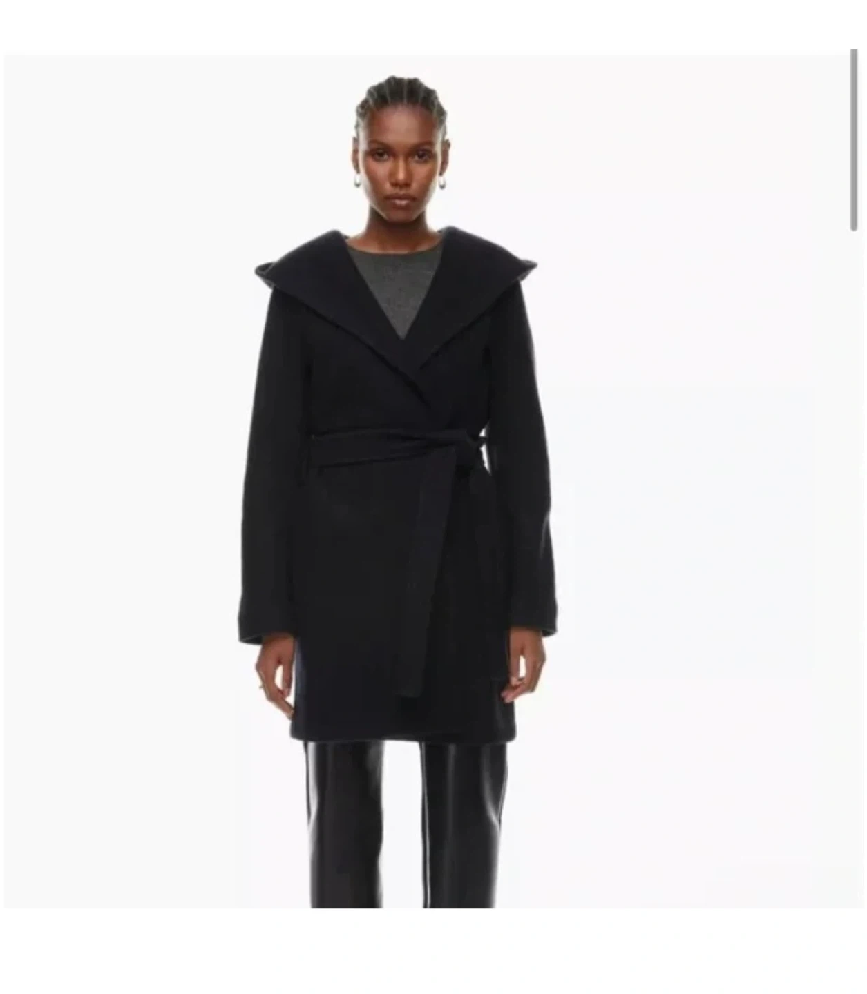 Selling a gently used Aritzia Wilfred coat in black! It's a size small and made of cozy wool material. Perfect for layering during the cooler months. It has a hood and a tie to cinch in the waist.