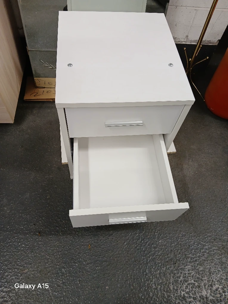 Here's a handy white bedside table! It has three drawers, perfect for storing your nighttime essentials. It's in great shape and ready to use in your bedroom or any space where you need a little extra storage
