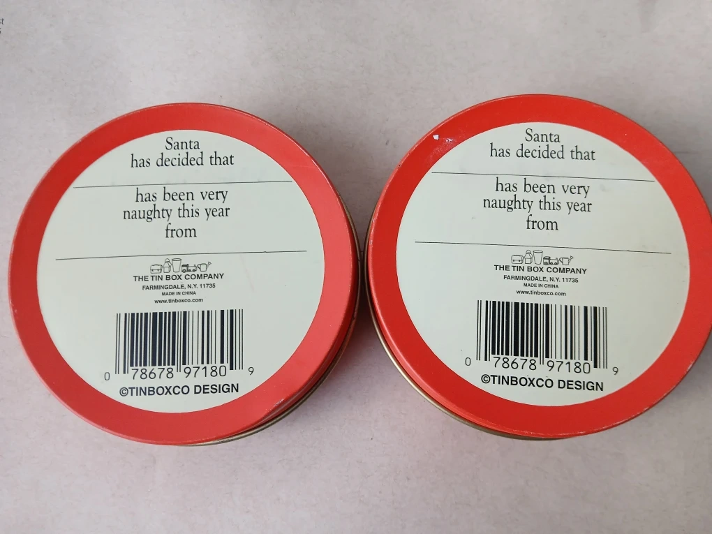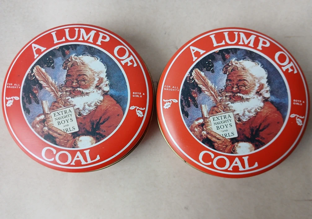 Two cute tins from The Tin Box Company! They feature Santa with a list of 'extra naughty boys and girls' and say 'A Lump of Coal'. You can name the recipient on the back of the tin.