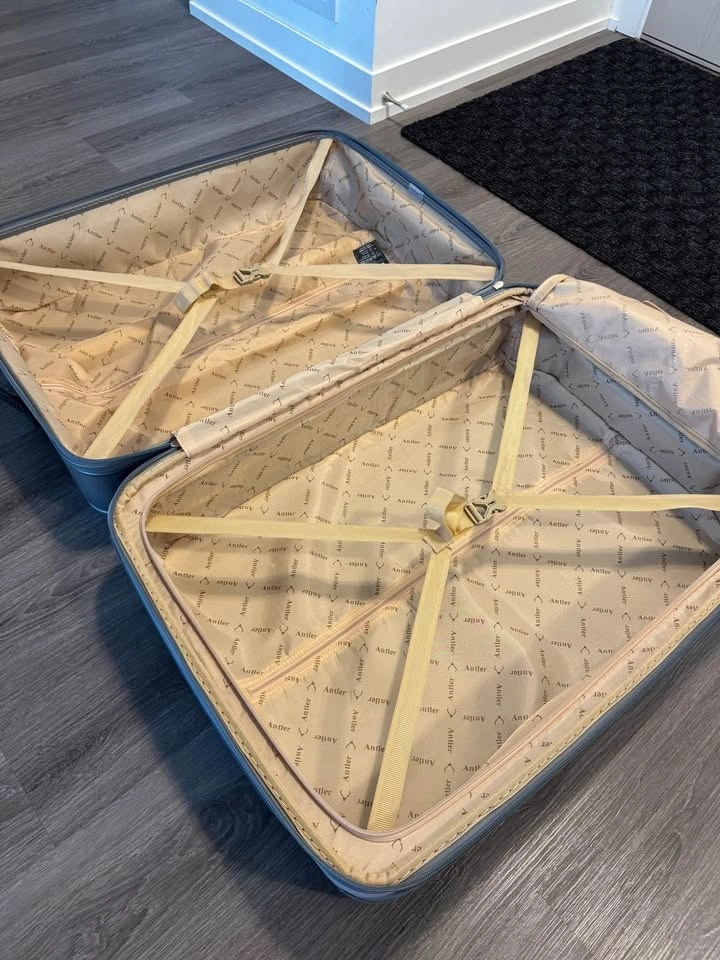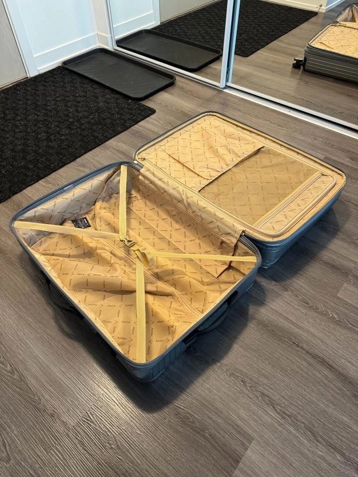 Selling a large Antler hard-shell suitcase at a very low price, with two damaged corners reinforced with duct tape, normal exterior wear, a fully working pull-up handle, wheels that roll perfectly fine, and an excellent interior, still great for transport, with the price reflecting the damage and photos showing the full size and close-ups of the taped areas.