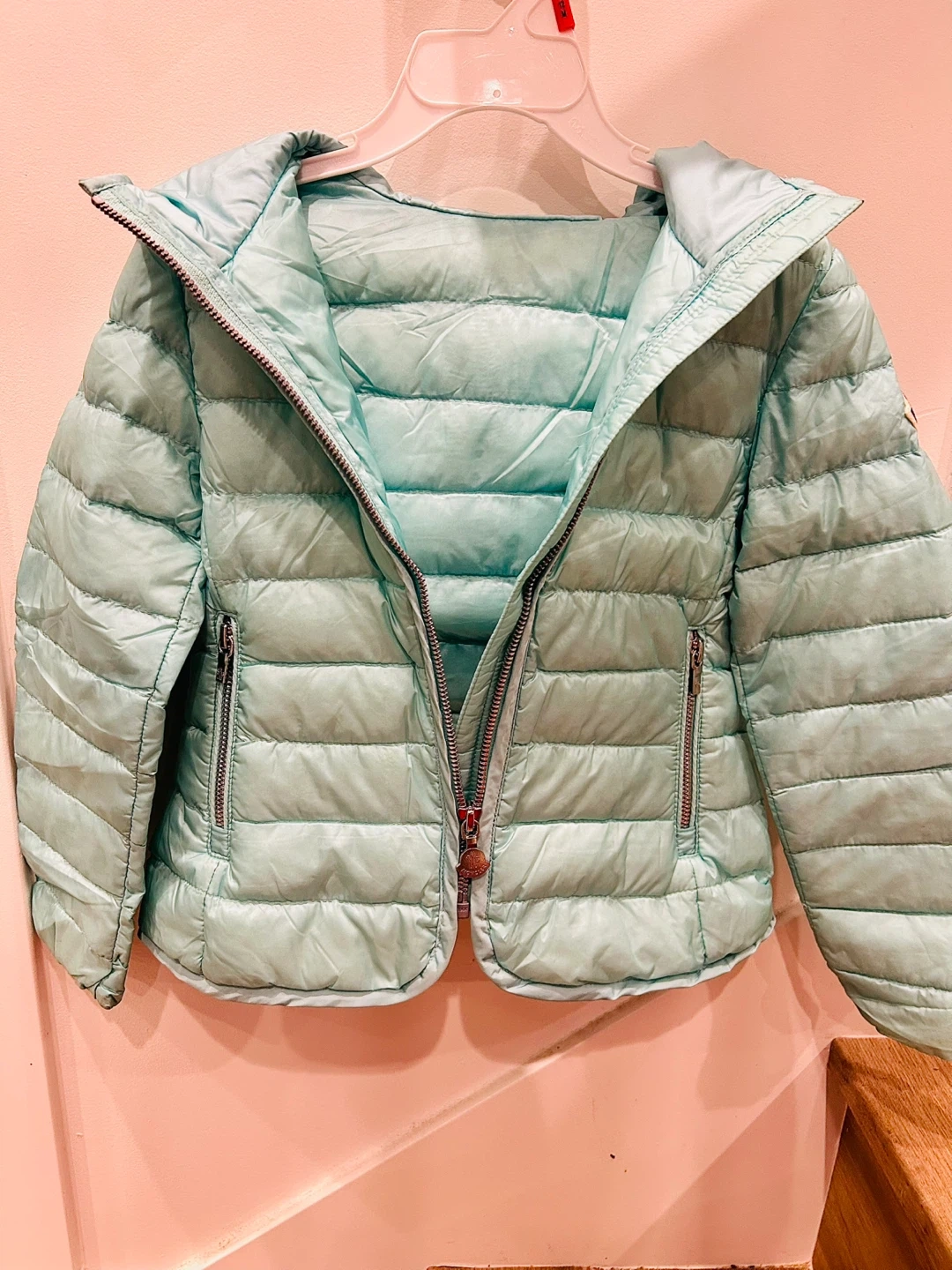 Selling a cute Moncler kids puffer jacket in a lovely mint colour! It's a down jacket, perfect for keeping your little one warm and stylish. The jacket is in excellent condition and comes with its original packaging.