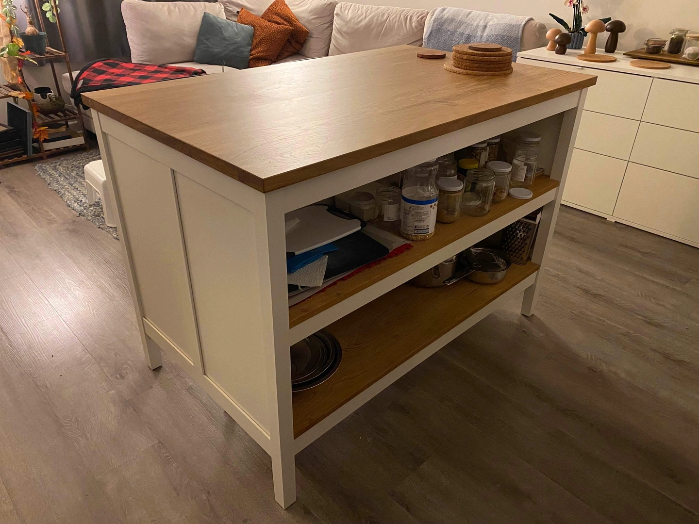 Selling a TORNVIKEN Kitchen Island in excellent condition. Great for extra kitchen storage and counter space, and doubles as a dining nook—seats two comfortably, or up to four. Features a solid wood countertop and plenty of shelf storage. Functional, stylish, and a beautiful upgrade to any space.