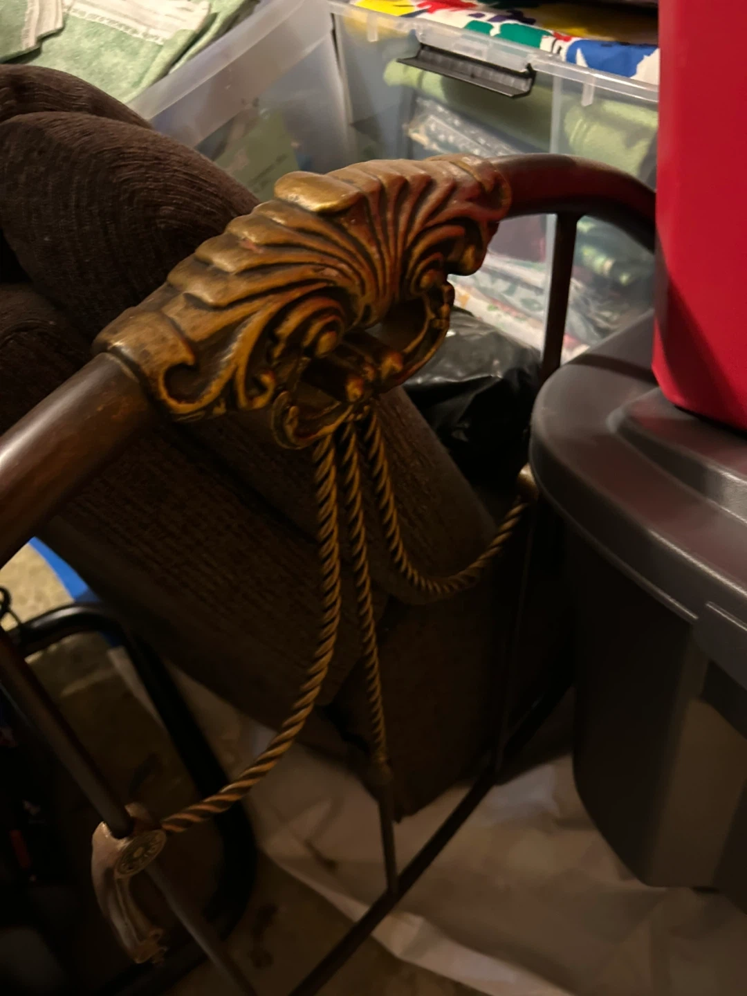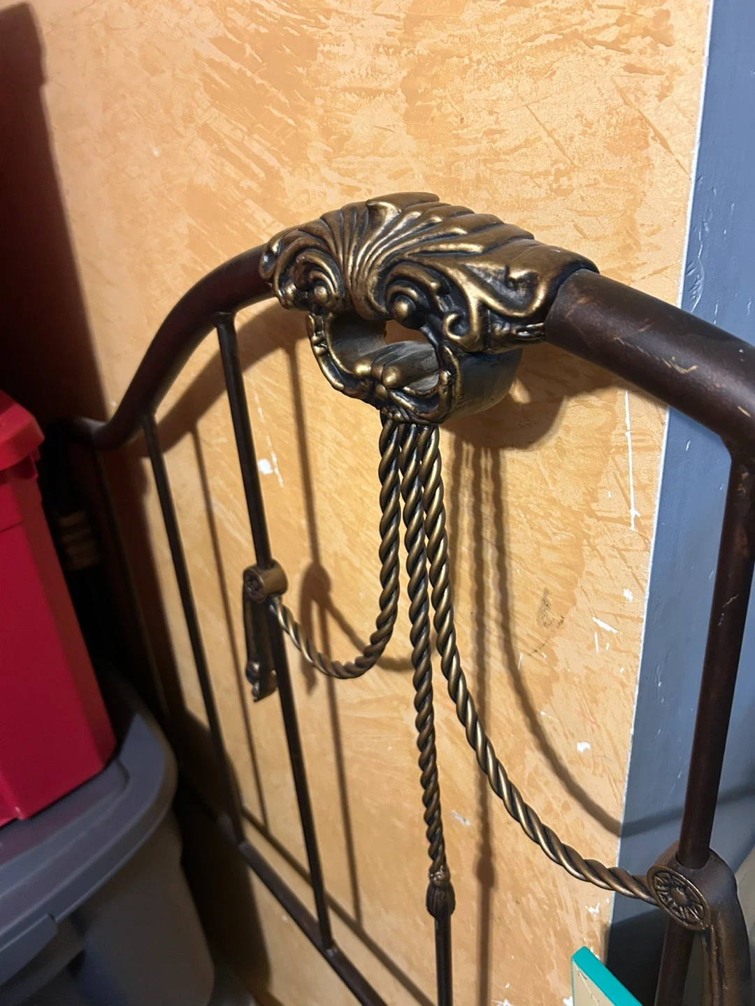 Selling a bed frame with an antique style. It features a metal construction with decorative gold accents and twisted rope detailing. The frame is in good condition and ready to add a touch of vintage charm to your bedroom