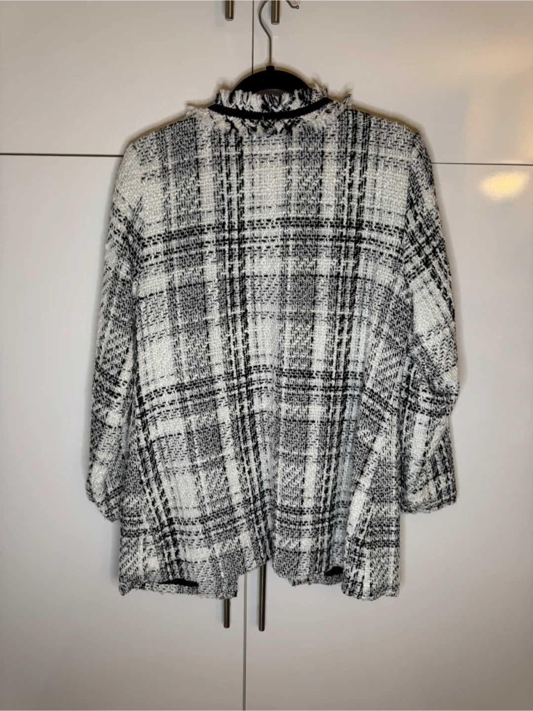 A stylish tweed jacket in a classic black and white pattern.