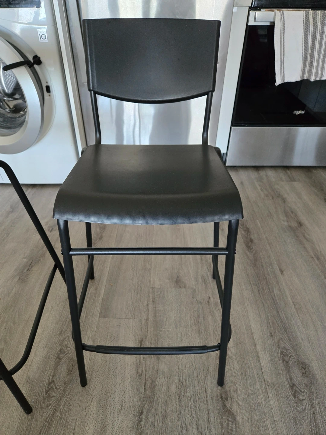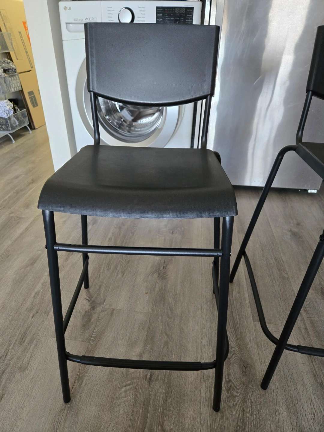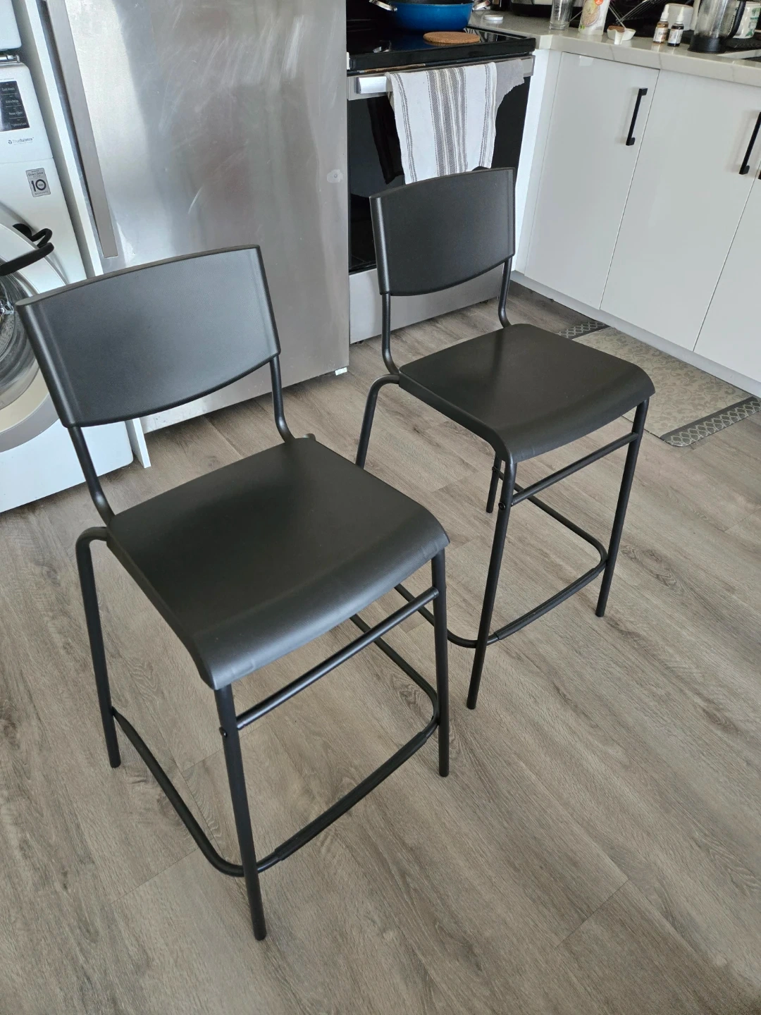 Selling 2x IKEA STIG counter-height bar stool in black with backrest. Durable plastic and metal construction, stylish design, and comfortable seating. Ideal for kitchen islands or home bars.