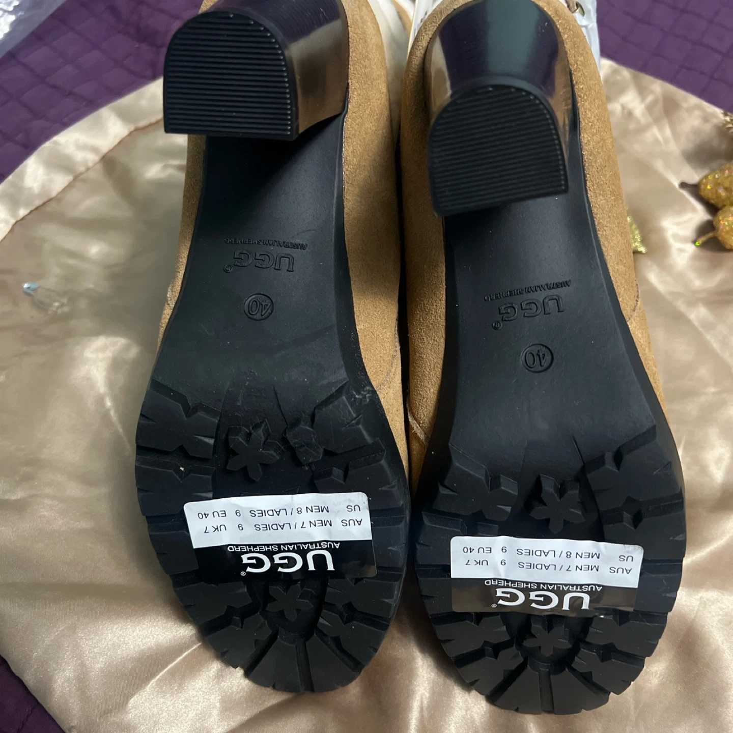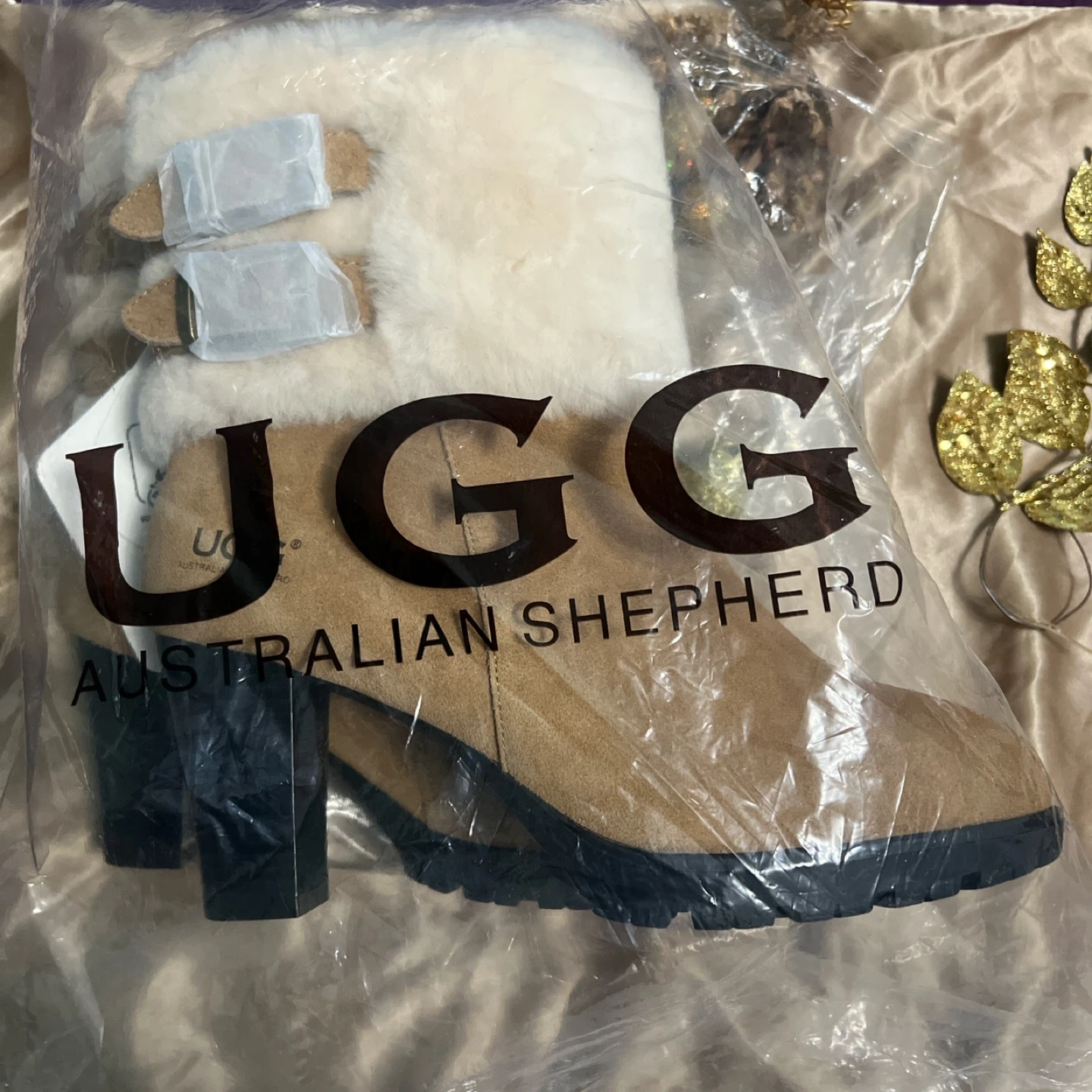 Tan and cream UGG boots — warm winter heels with excellent grip.