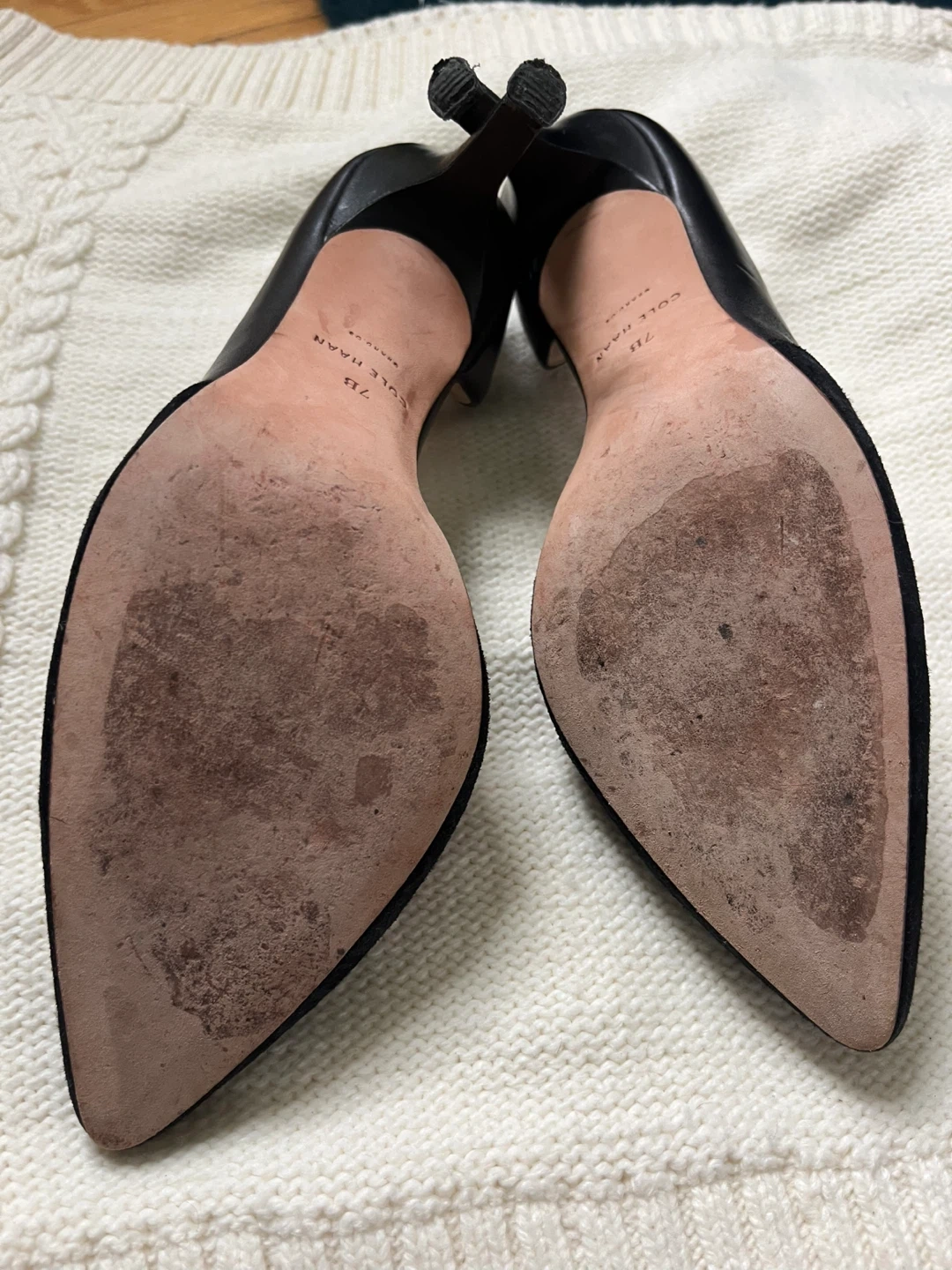 Cole Haan elegant heels size 7. Pointed toe, front black suede, side and back black leather. Open sided instep. Super elegant shoe. 3 inch heels, leather soul, very comfortable. Great condition. Open to other meeting locations within reason.