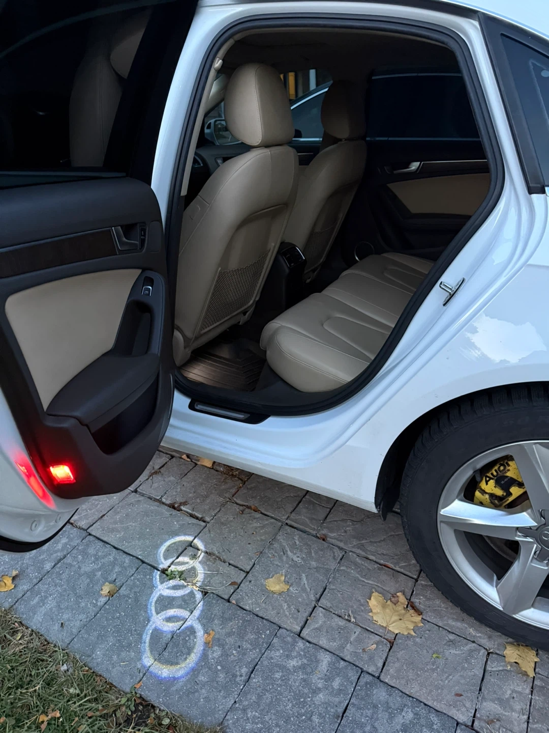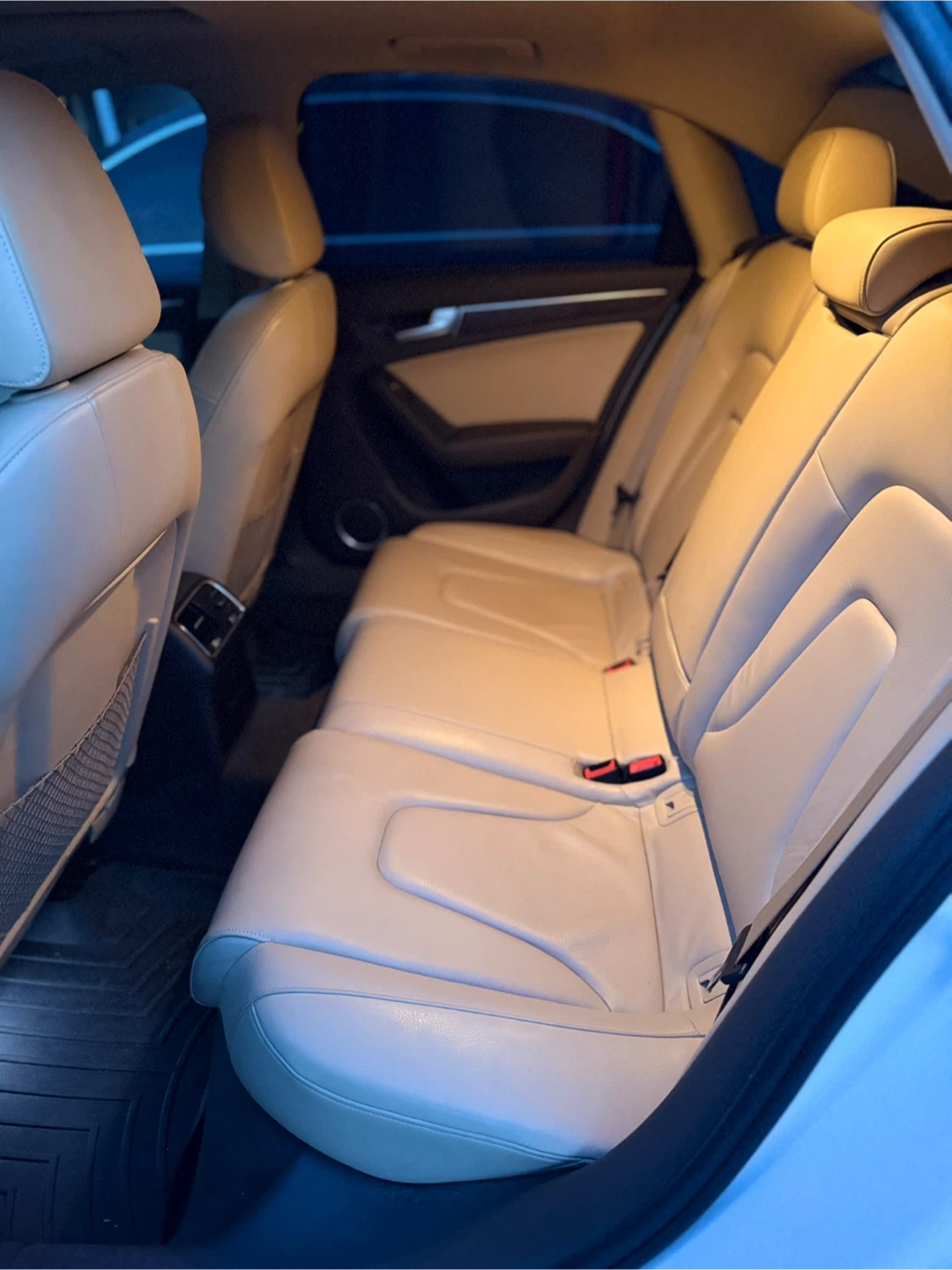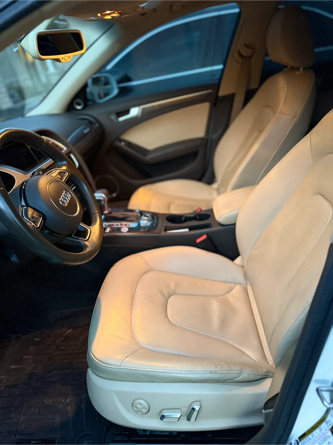 Selling a white Audi A4 sedan. The interior features beige leather seats. It's in good condition and ready for its next owner!